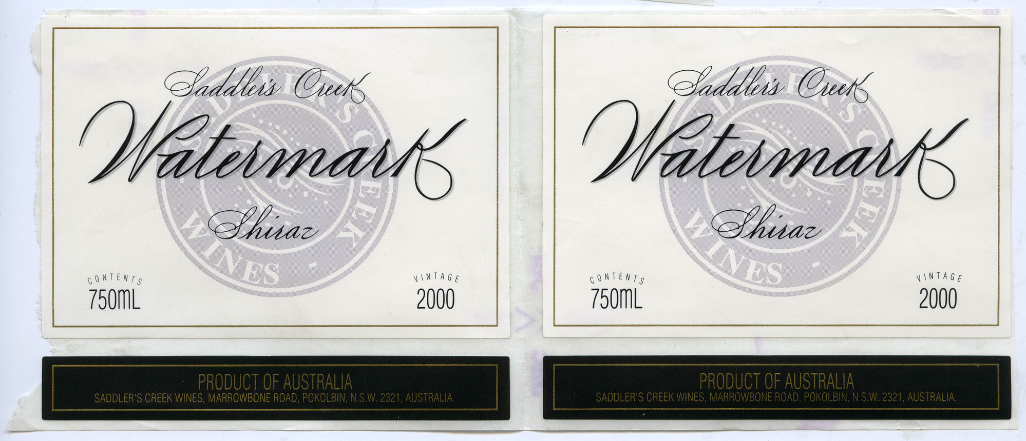Label reads: "Saddler's Creek Watermark SHIRAZ Contents 750ml Vintage 2000 Product of Australia Saddler's Creek Wines Marrowbone Road Pokolbin NSW 2321 Australia"
