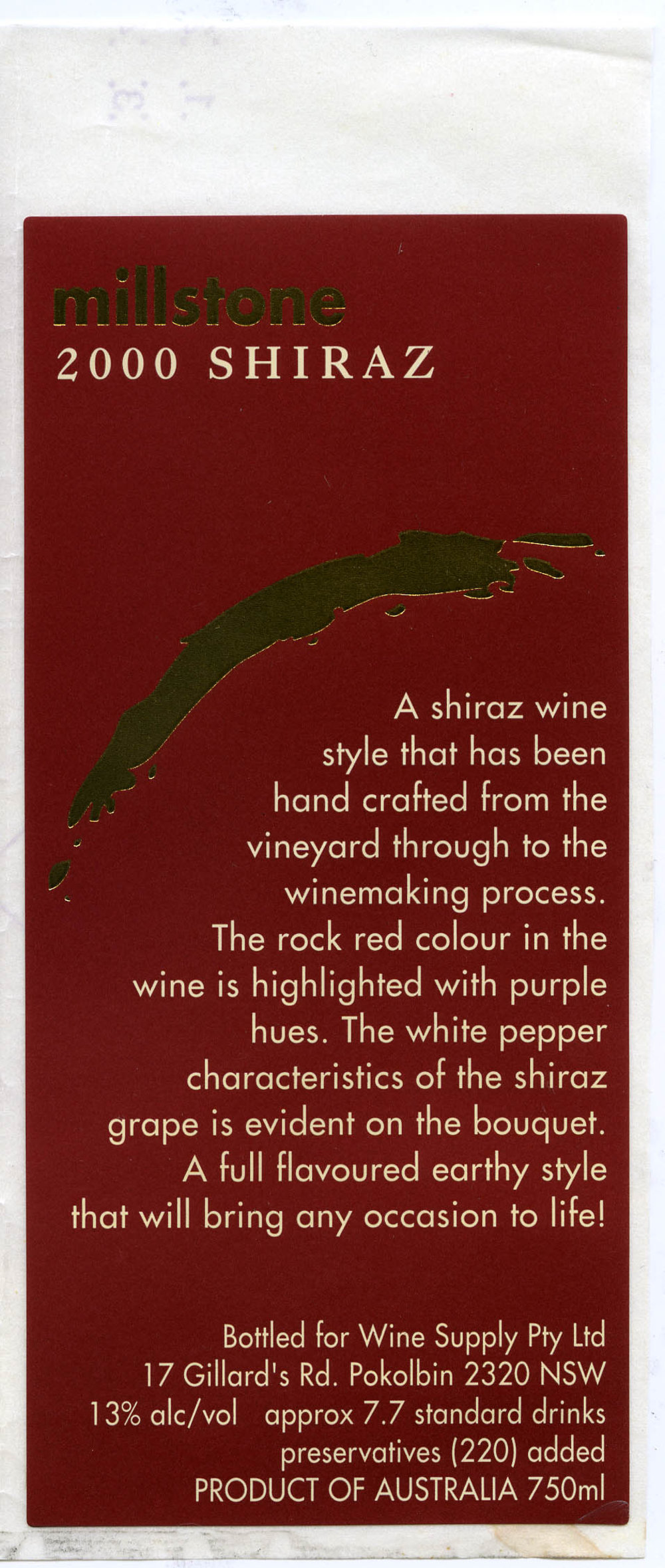 Label reads: "Millstone 2000 SHIRAZ A shiraz wine style that has been hand crafted from the vineyard through to the winemaking process. The rock red colour in the wine highlighted purple hues The white pepper characteristics of the shiraz grape is evident on the bouquet A full flavoured earthy style that will bring any occasion to life Bottled for Wine Supply Pty. Ltd. 17 Gillard's Rd Pokolbin 2320 NSW 13% Alc/Vol approx7.7 standard drinks preservatives (220) added Product of Australia 75ml"