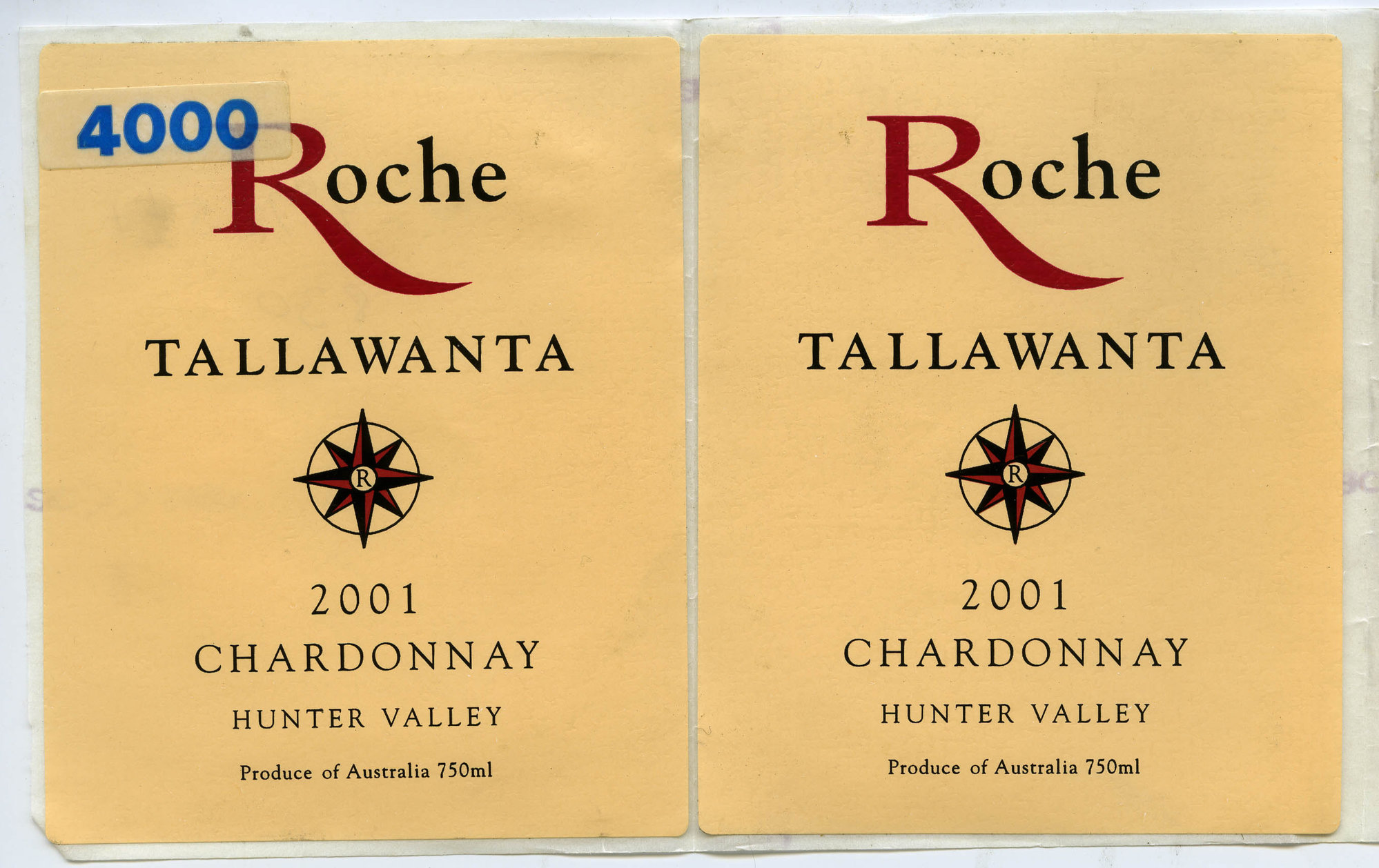 Label reads: "Roche Tallawanta 2001 CHARDONNAY Hunter Valley Produce of Australia 750ml"