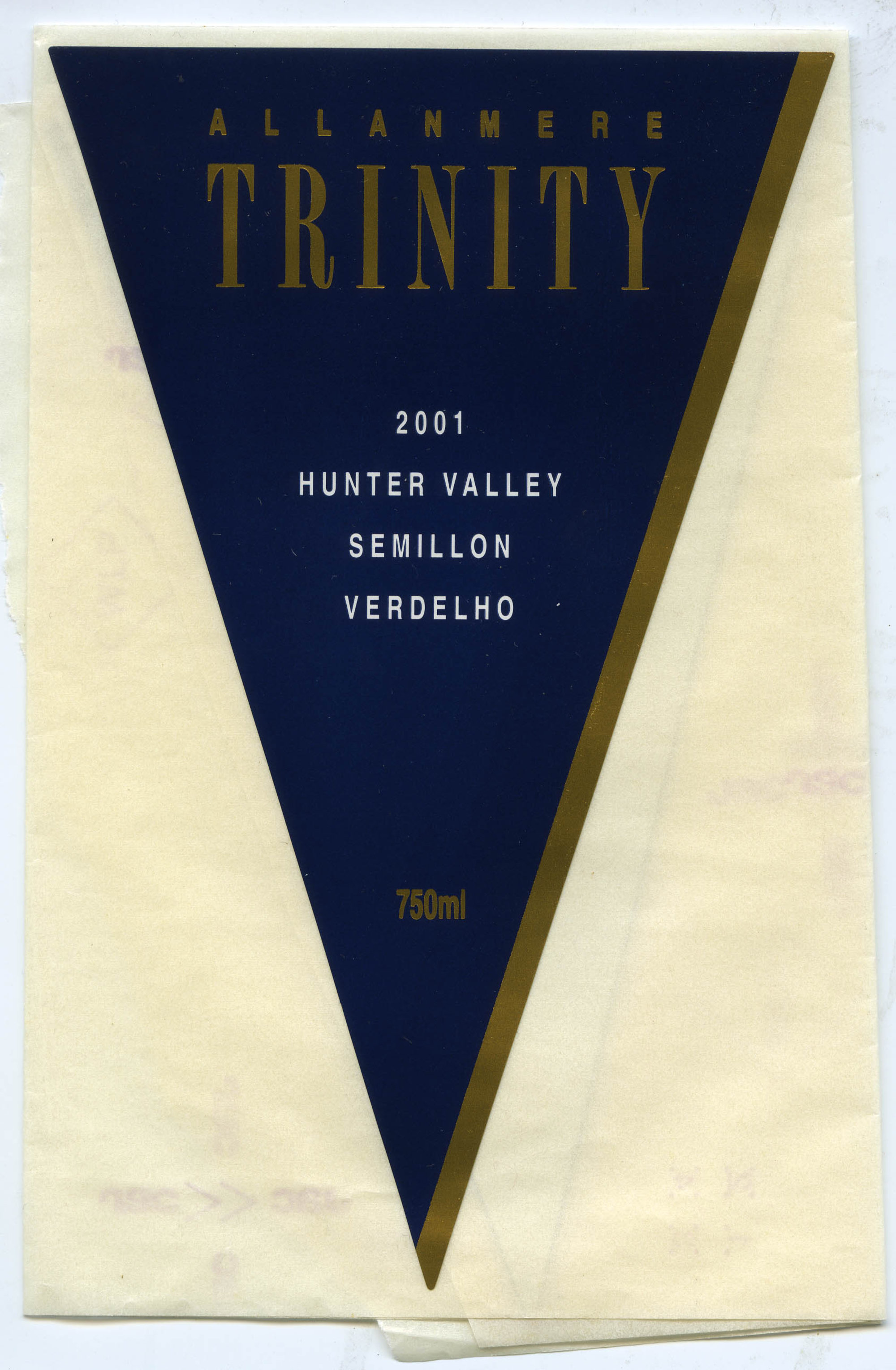 Label reads:Allanmere Trinity 2001 Hunter Valley SEMILLON VERDELHO 750ml"