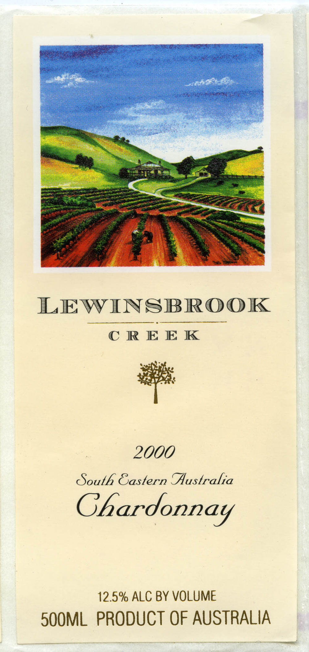 Label reads: "LEWINSBROOK CREEK 2000 South Eastern Australia CHARDONNY 12.5% alc by volume 500ml Product of Australia"