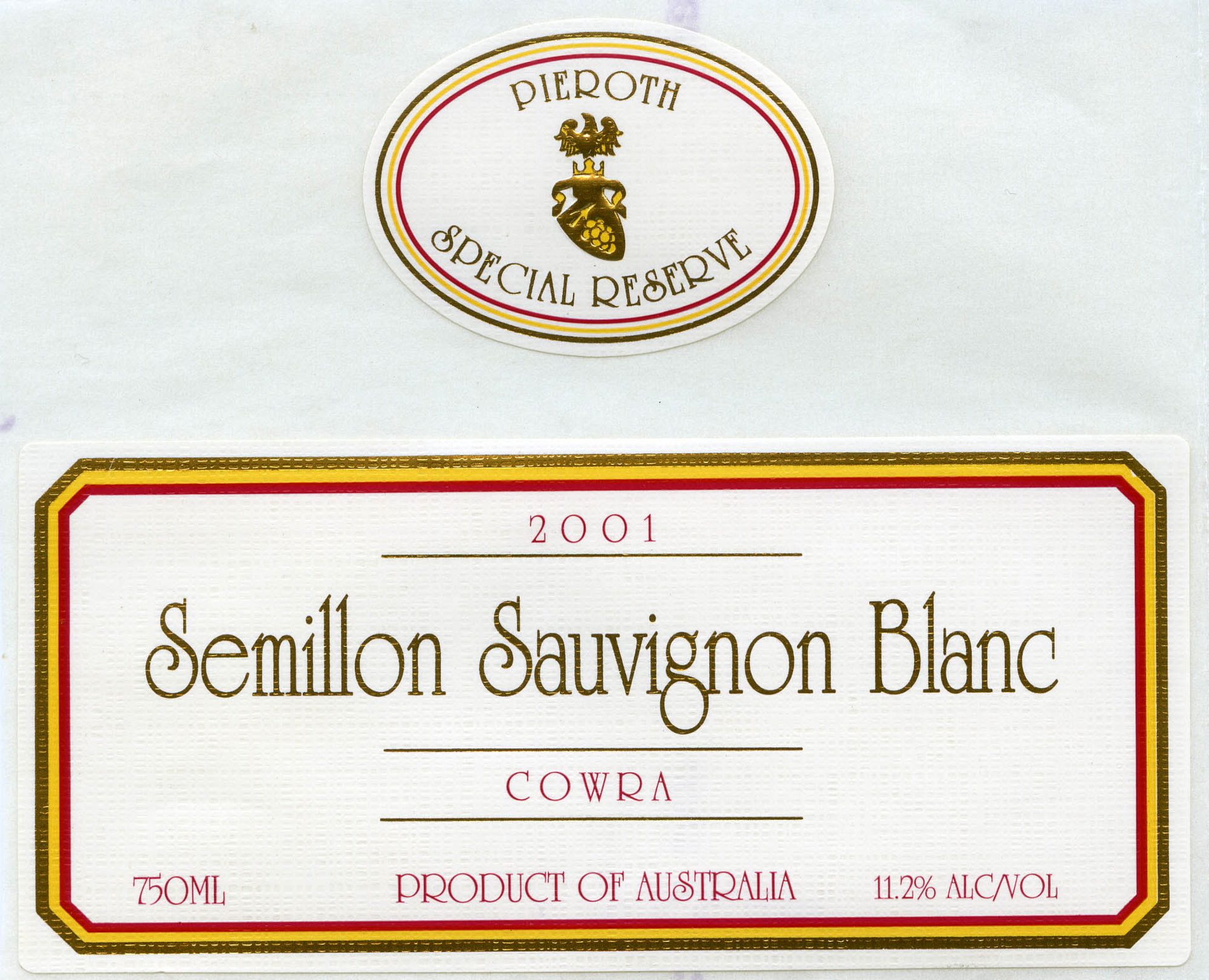 Label reads: "Pieroth Special Reserve 2001 SEMILLON SAUVIGNON BLANC Cowra 750ml Product of Australia 11.2% Alc/Vol"