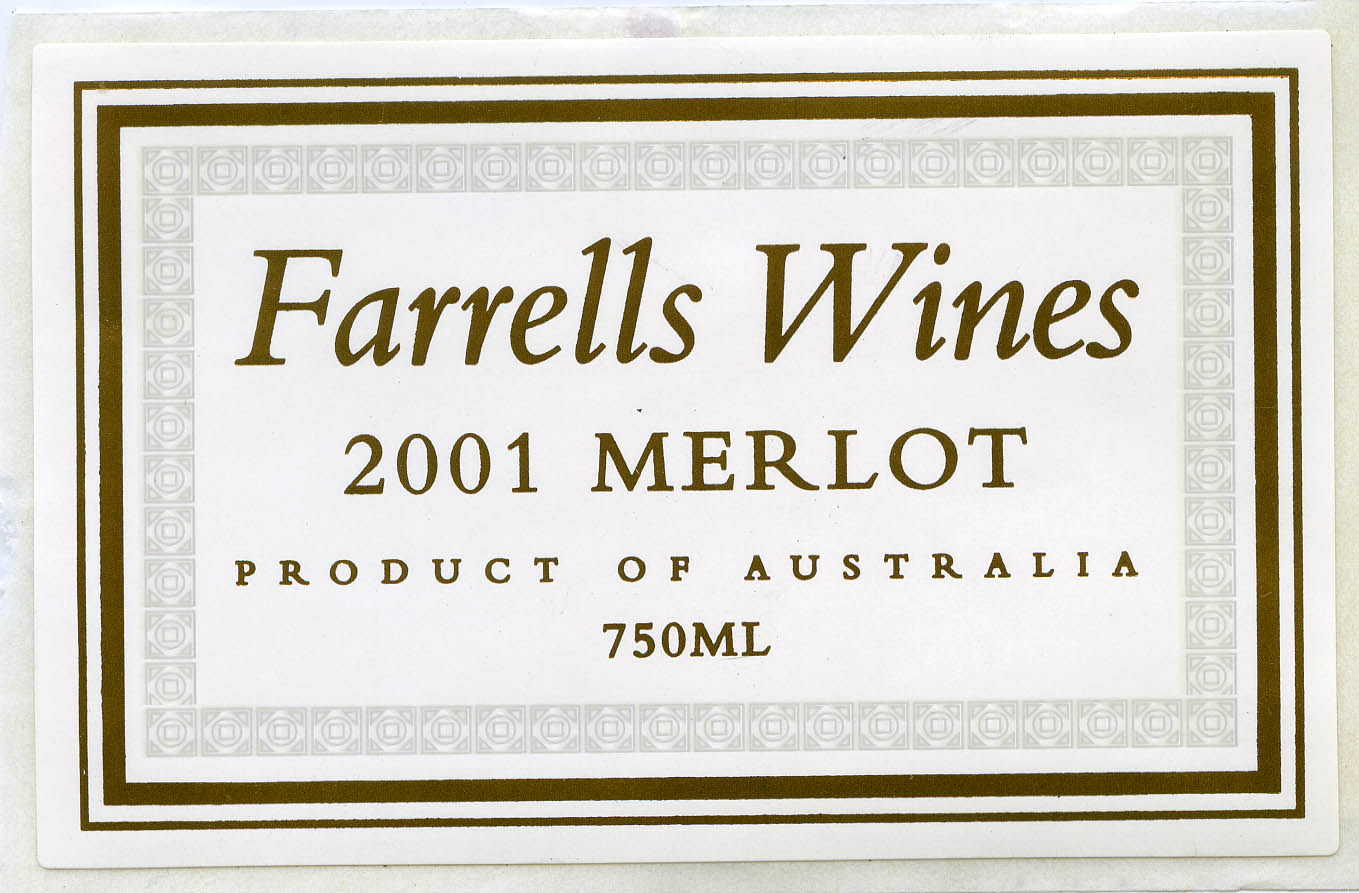 Label reads: "Farrells Wines 2001 MERLOT Product of Australia 750ml"