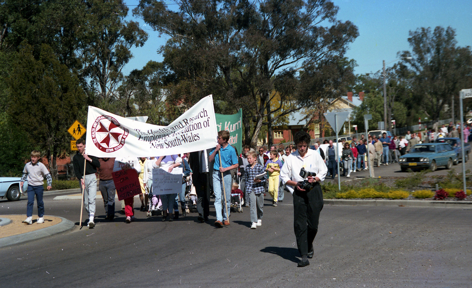 Banner of the Health and Research Employees Association leading the Save Kurri Hospital - March, Lang Street, Kurri Kurri, NSW, September 1989
