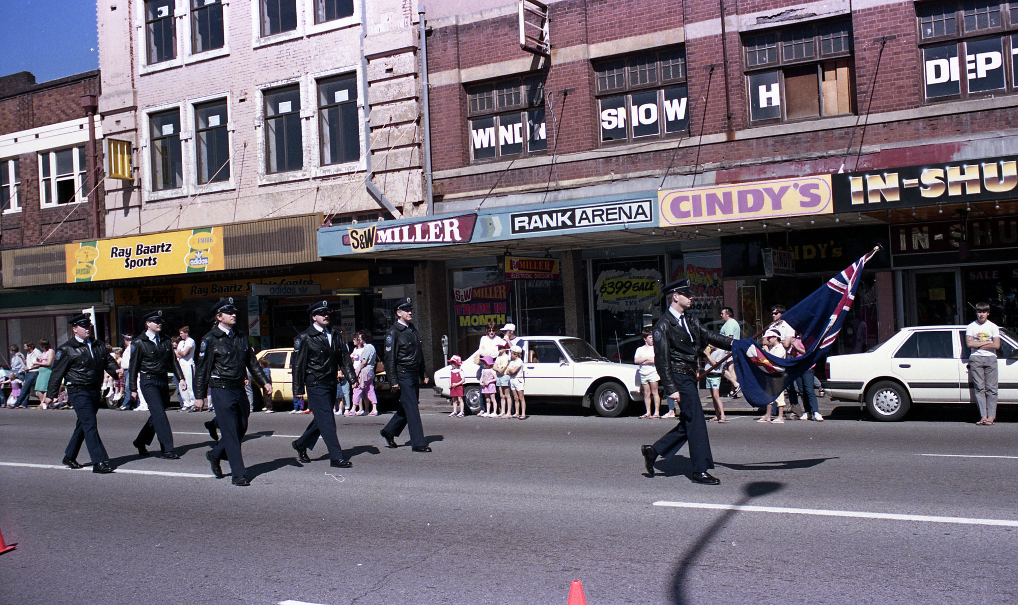 Sternbeck, Percival William, 1921-2004, Marching police officers, Mattara procession, Newcastle, NSW, September 1986 (Between 1st September 1986 and 30th September 1986), [Sternbeck_Bk11_Mattara_0986b_008]. Living Histories, accessed 19/03/2026, https://livinghistories.newcastle.edu.au/nodes/view/65450