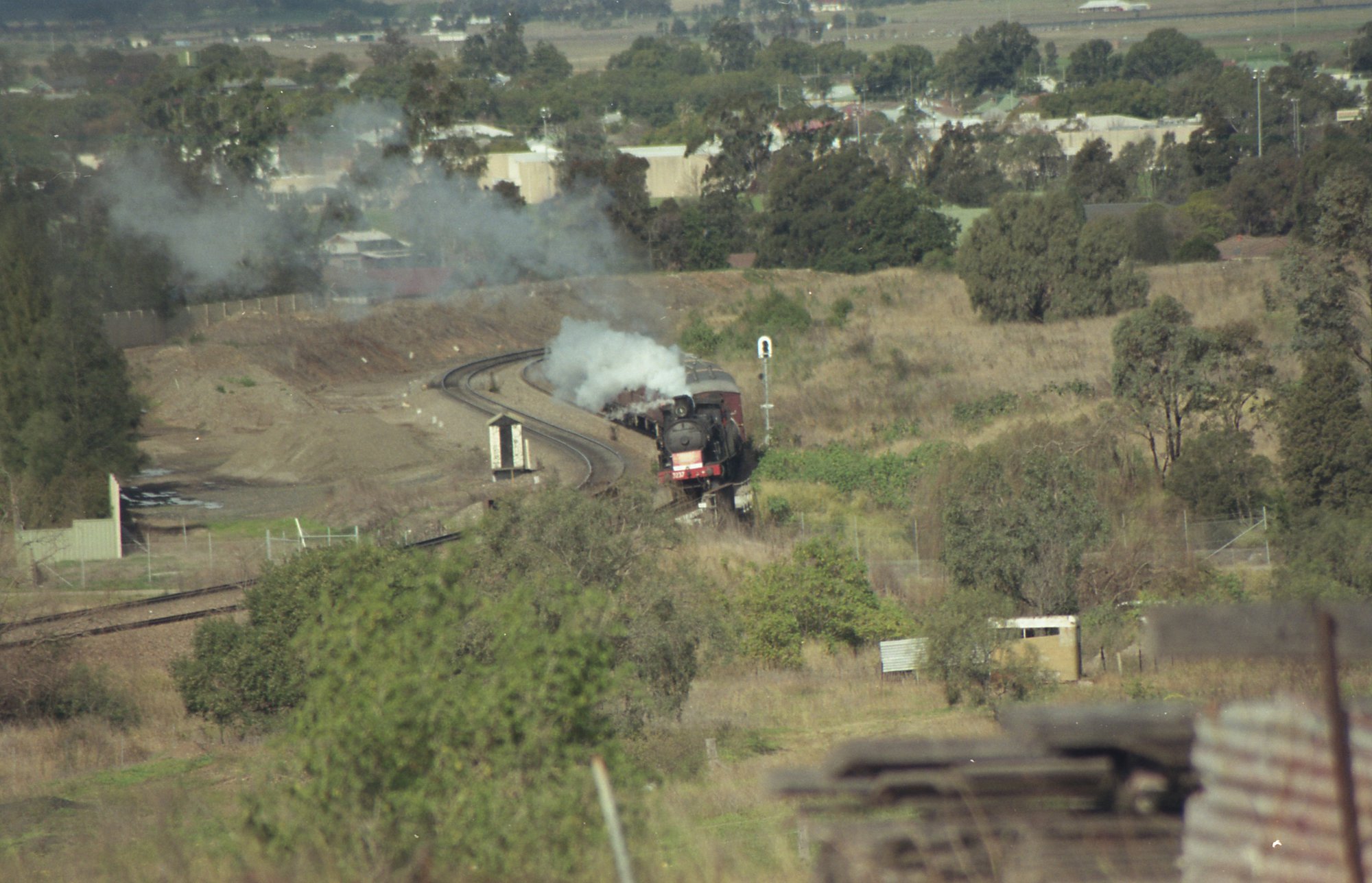 Sansom, Peter, 3237 with its train crossing the New England Highway, July 2011. (July 2011), [222_werris_sansom]. Living Histories, accessed 20/03/2026, https://livinghistories.newcastle.edu.au/nodes/view/65800