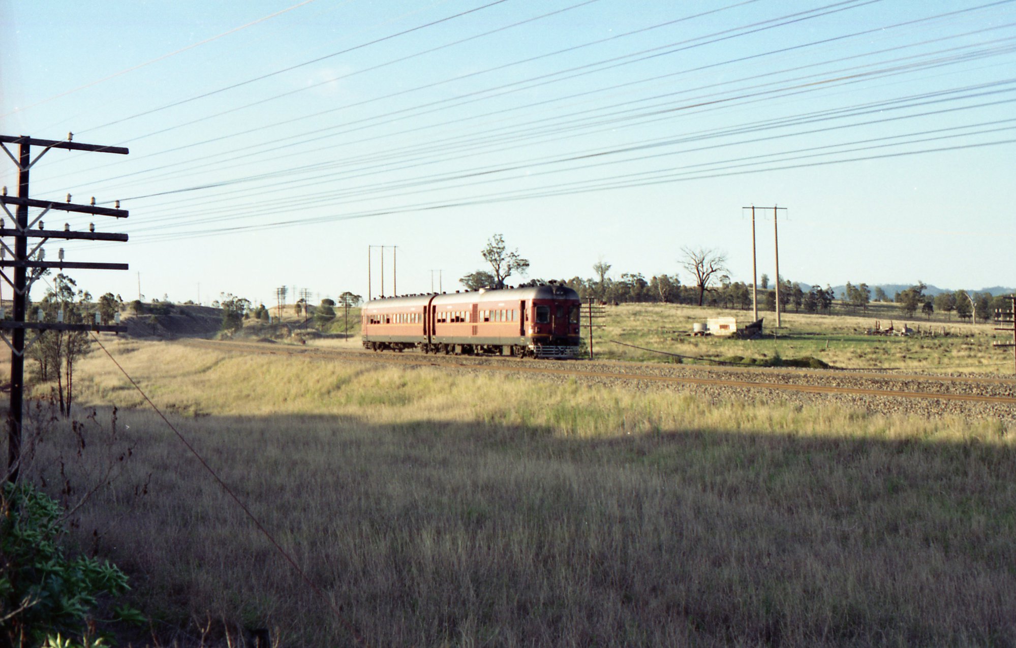 A 620 class rail motor and trailer heading south at Newdell Junction, NSW