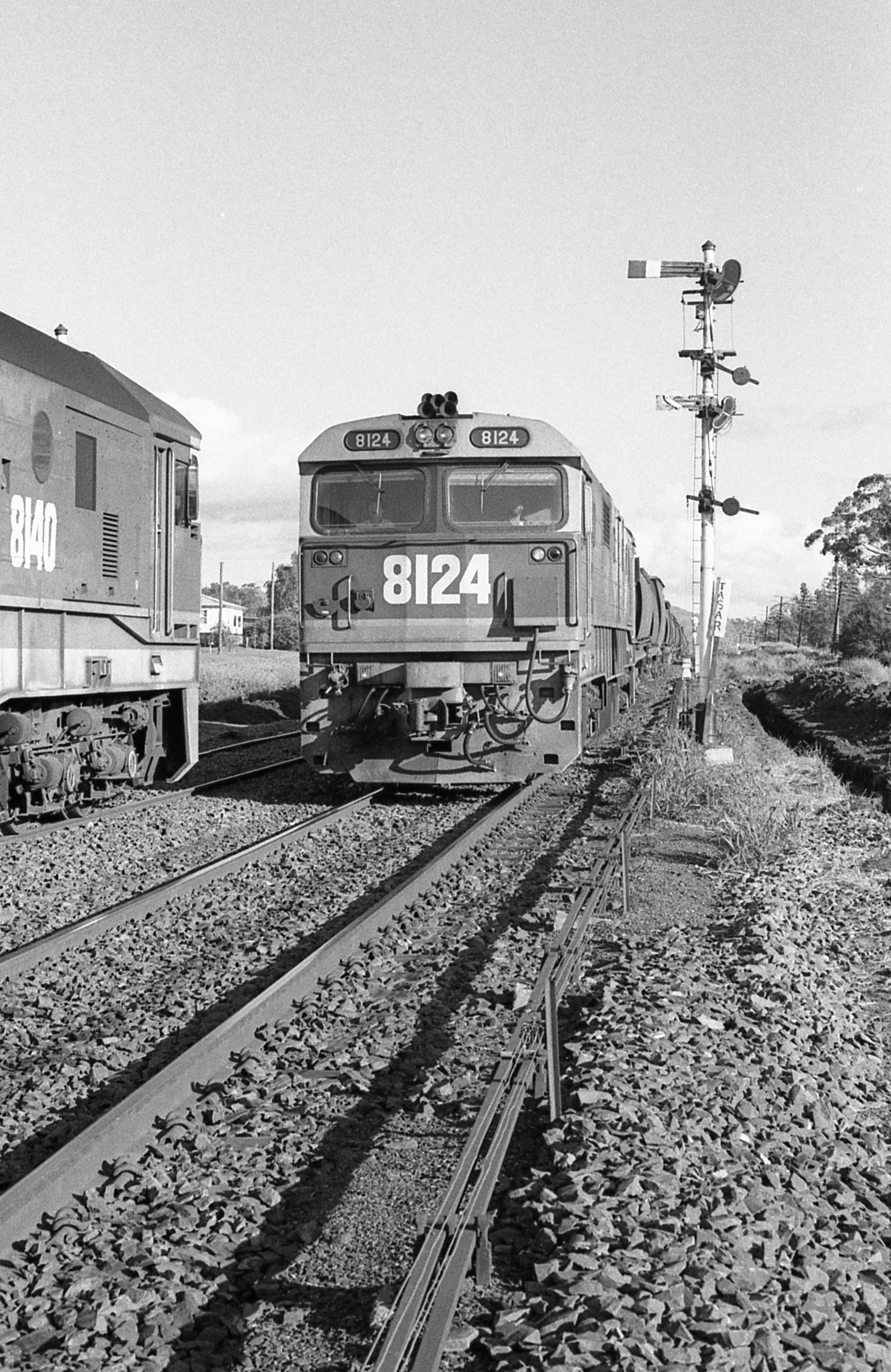 8124 on an empty grain train crosses 8140 on a loaded coal train at Willow Tree, NSW