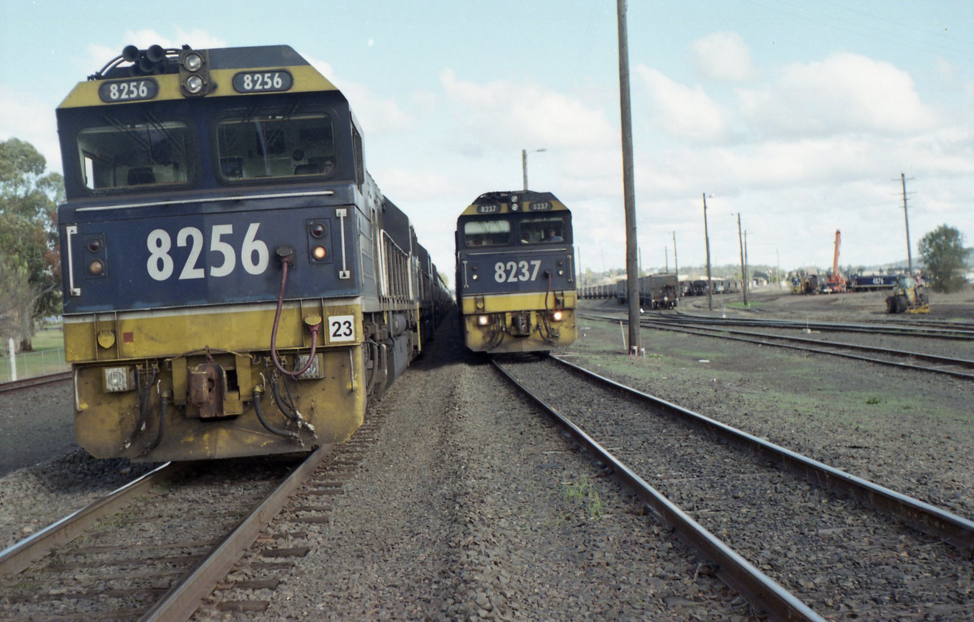 8256 with its train on the main line with 8237 and its train on the loop at Werris Creek, NSW