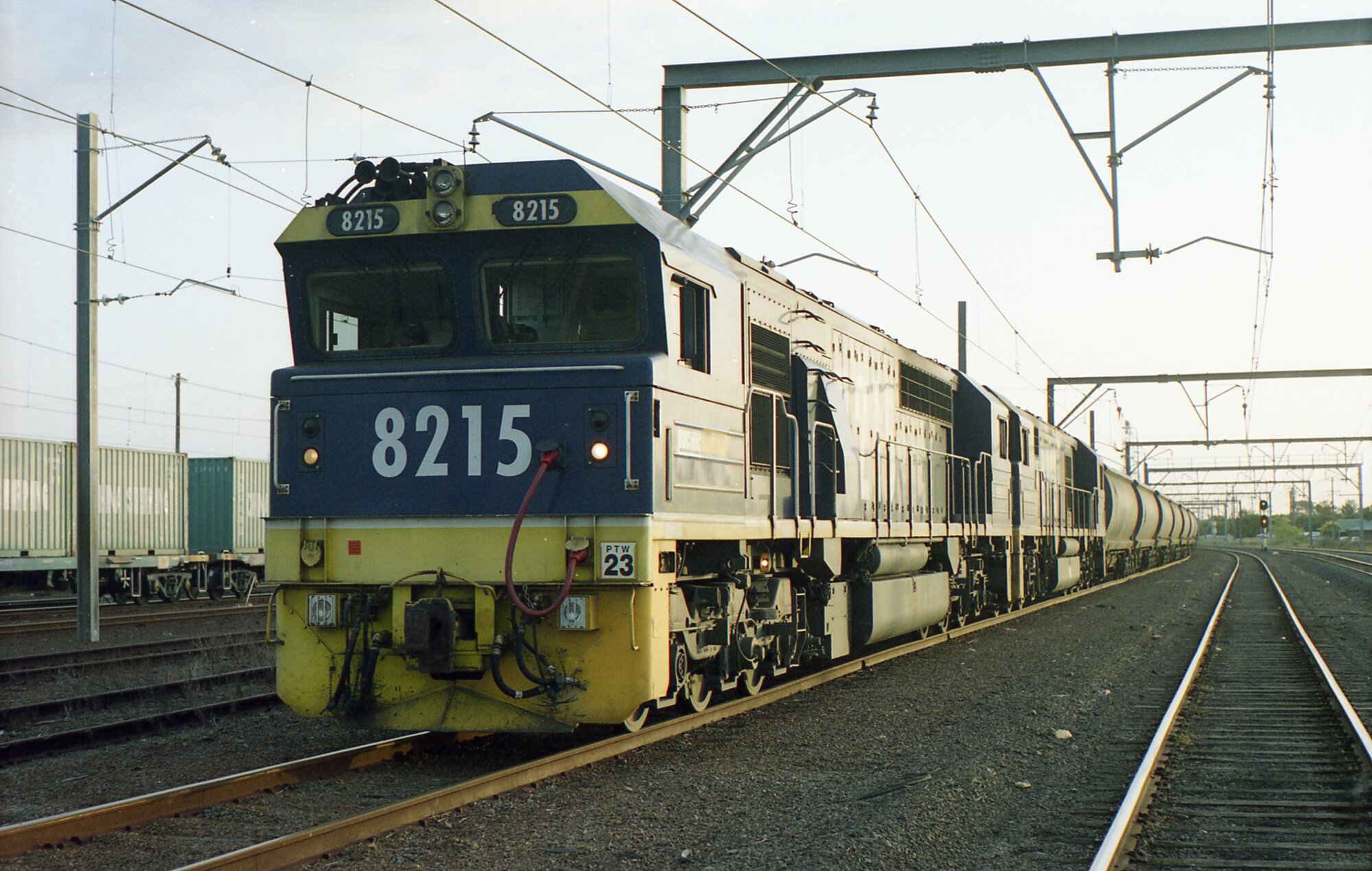 8215 and a classmate on unit 23 stand on the up relief at Broadmeadow, March 2003.