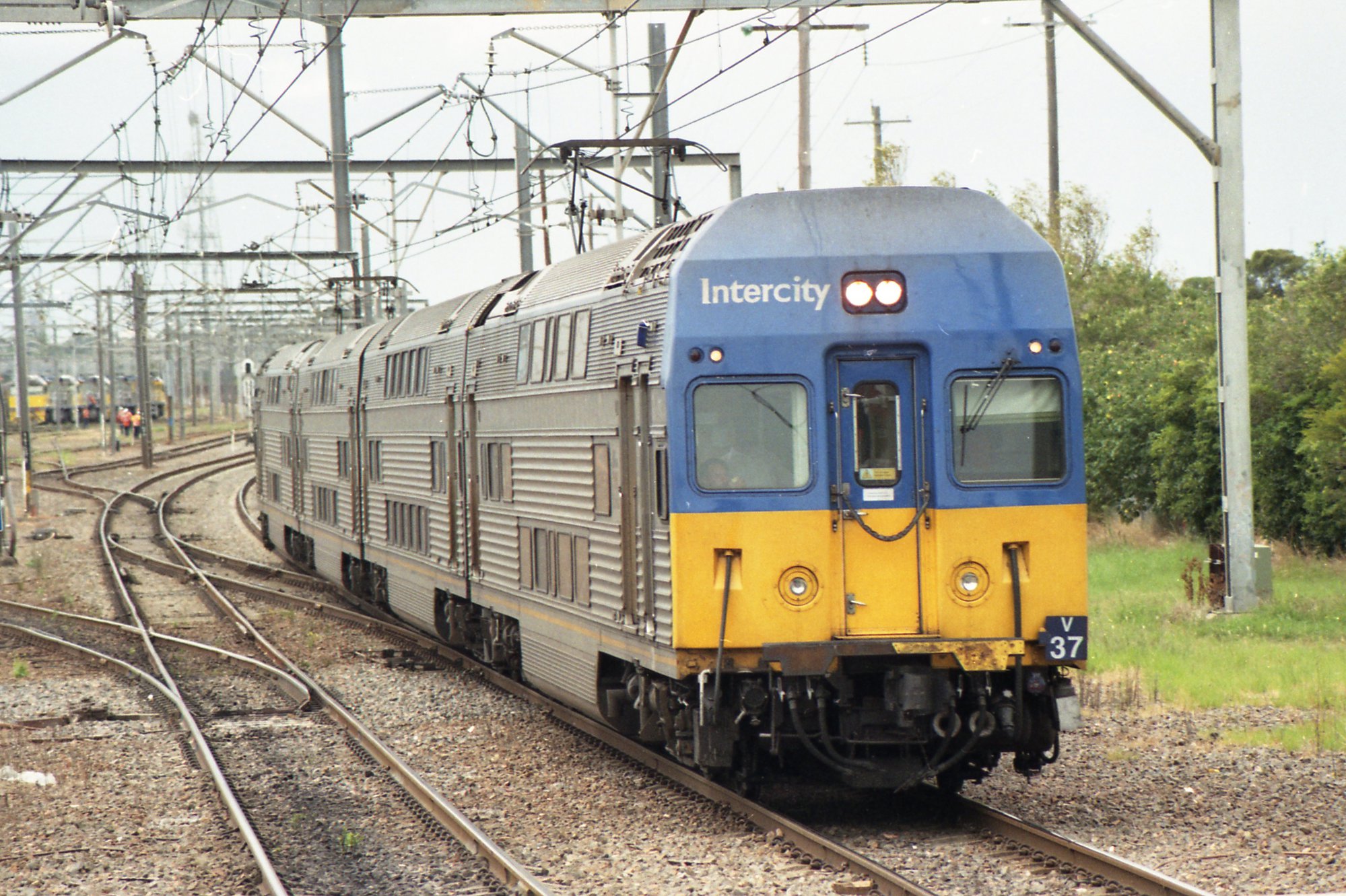 V set 37 about to cross the level crossing at Adamstown on its way to Sydney, February 2011.