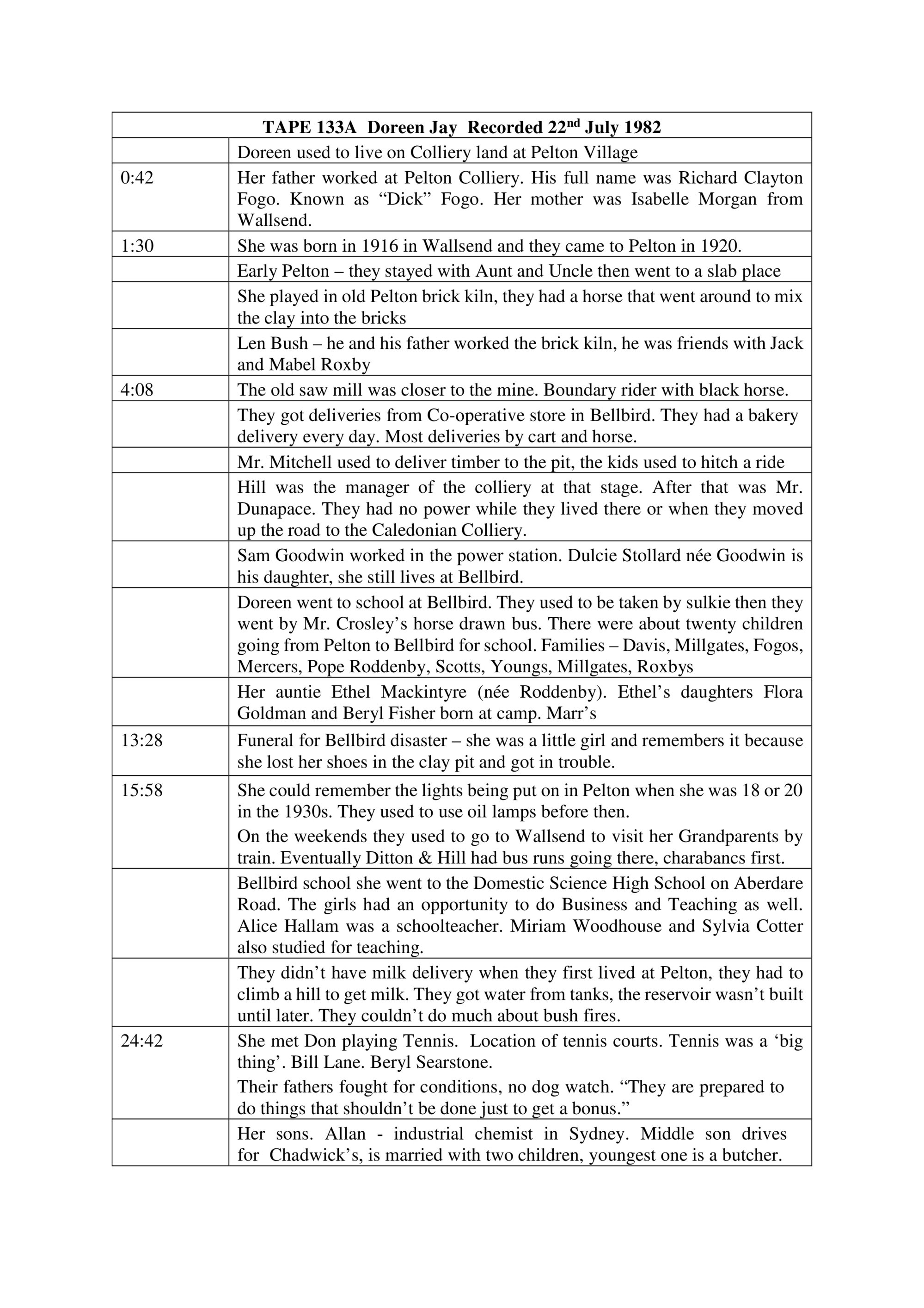 Jay née Fogo, Doreen, 1916-1997, Summary: Doreen Jay née Fogo (1916-1997), & Donald Jay (-1997) - Pelton Colliery. Recorded 22 July 1982. Part 1/1., [133A]. Living Histories, accessed 13/02/2026, https://livinghistories.newcastle.edu.au/nodes/view/67071