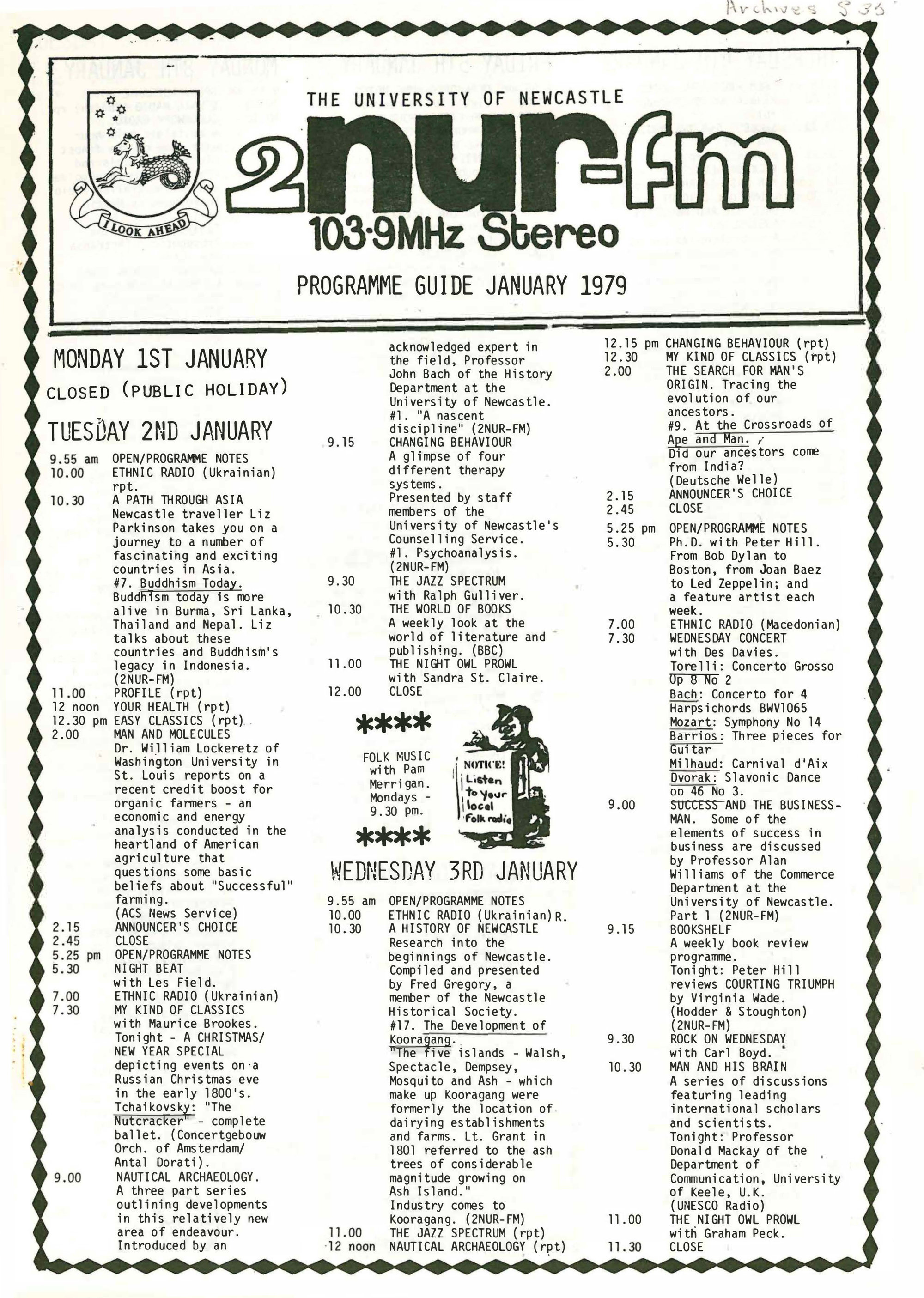 2NUR, 2NUR FM Programme Guide January 1979 (1st January 1979), [S35]. Living Histories, accessed 14/04/2026, https://livinghistories.newcastle.edu.au/nodes/view/67849