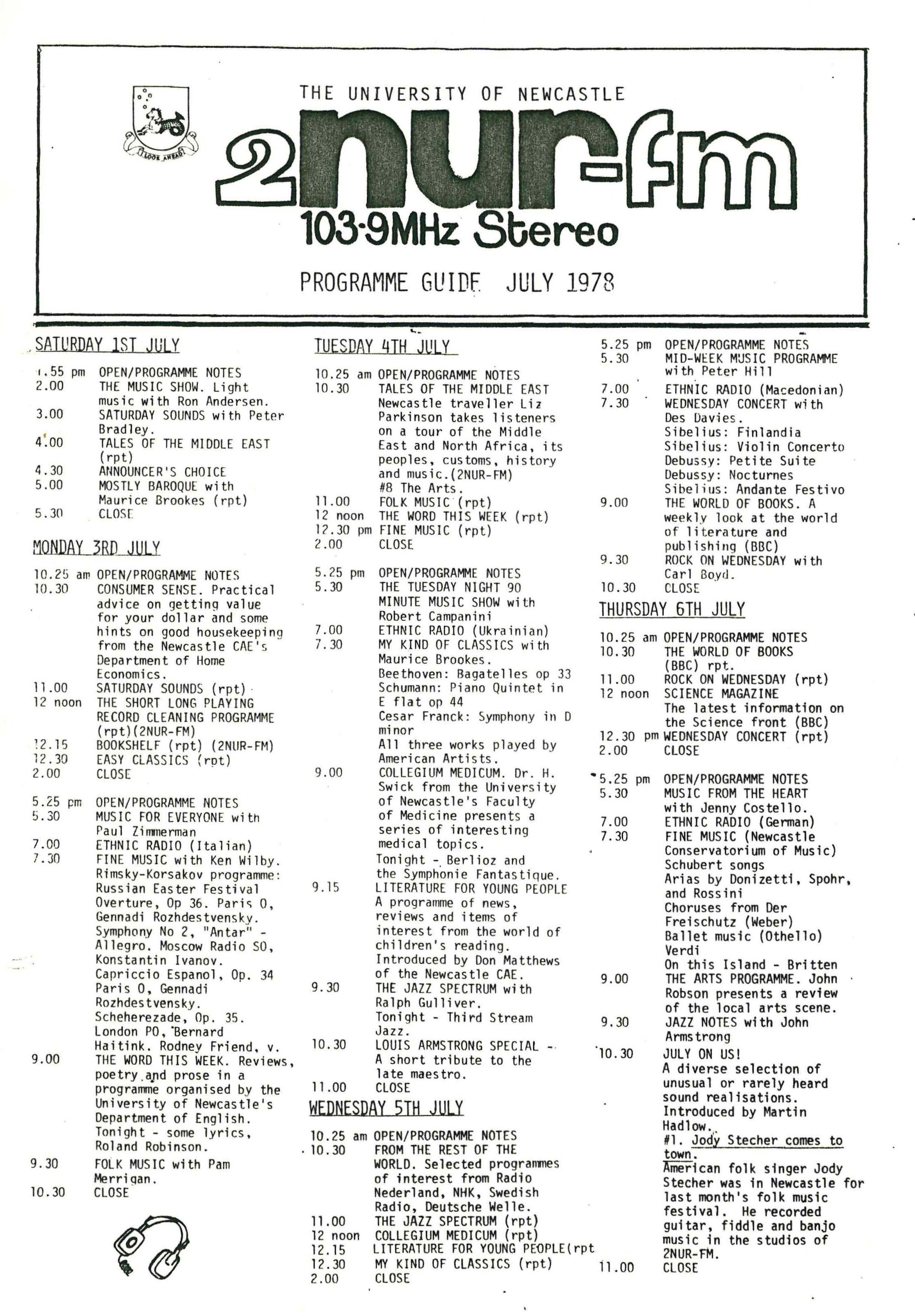 2NUR, 2NUR FM Programme Guide July 1978 (1st July 1978), [S35]. Living Histories, accessed 14/04/2026, https://livinghistories.newcastle.edu.au/nodes/view/67853
