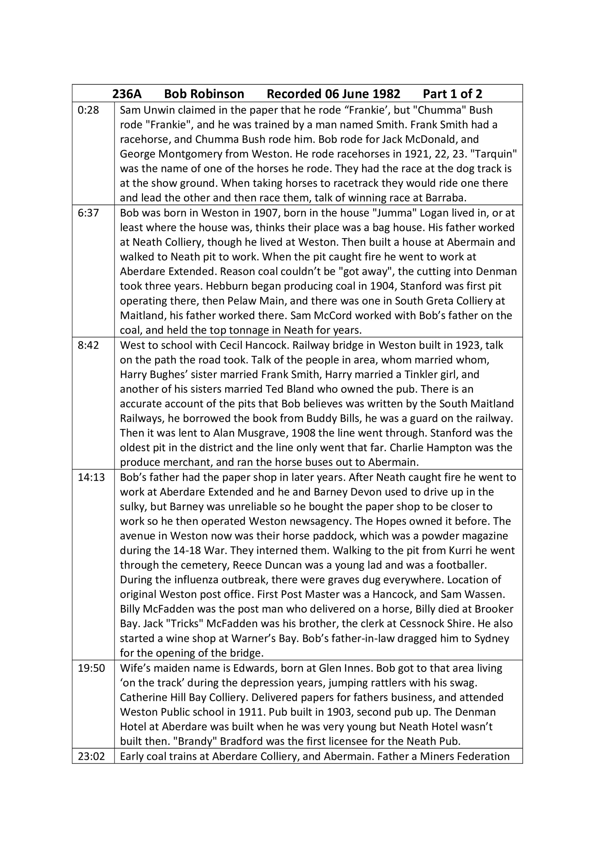 Delaney, Jack, 1919-2010, Summary: Bob Robinson (1907-1990) - Mine worker and jockey. Recorded 6 June 1982. Part 1/2., [236A]. Living Histories, accessed 08/02/2026, https://livinghistories.newcastle.edu.au/nodes/view/68449