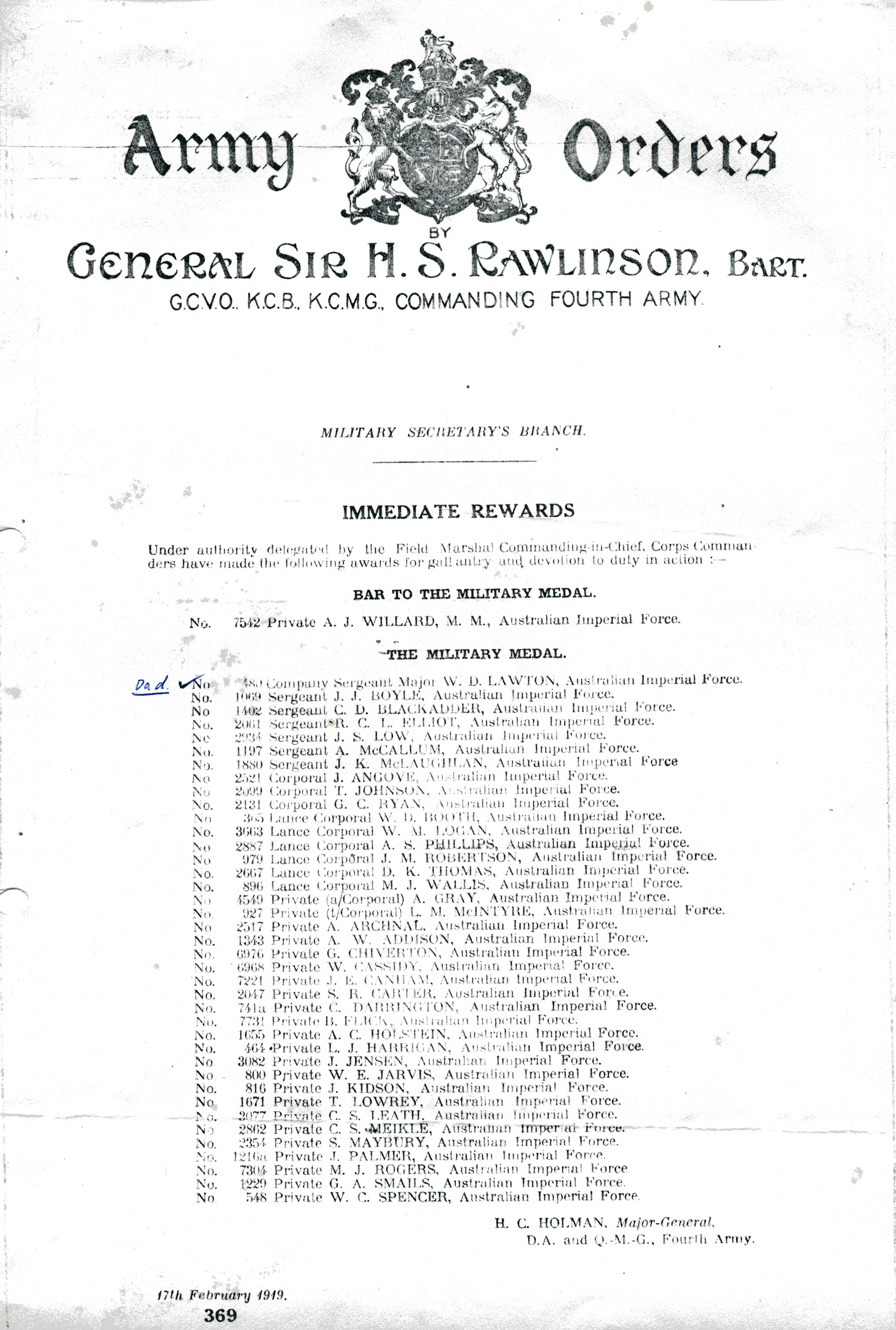 Army Orders, Military Secretary's Branch, Military Medal (1919-02-17), [C2018(i)_030]. Living Histories, accessed 19/03/2026, https://livinghistories.newcastle.edu.au/nodes/view/68869