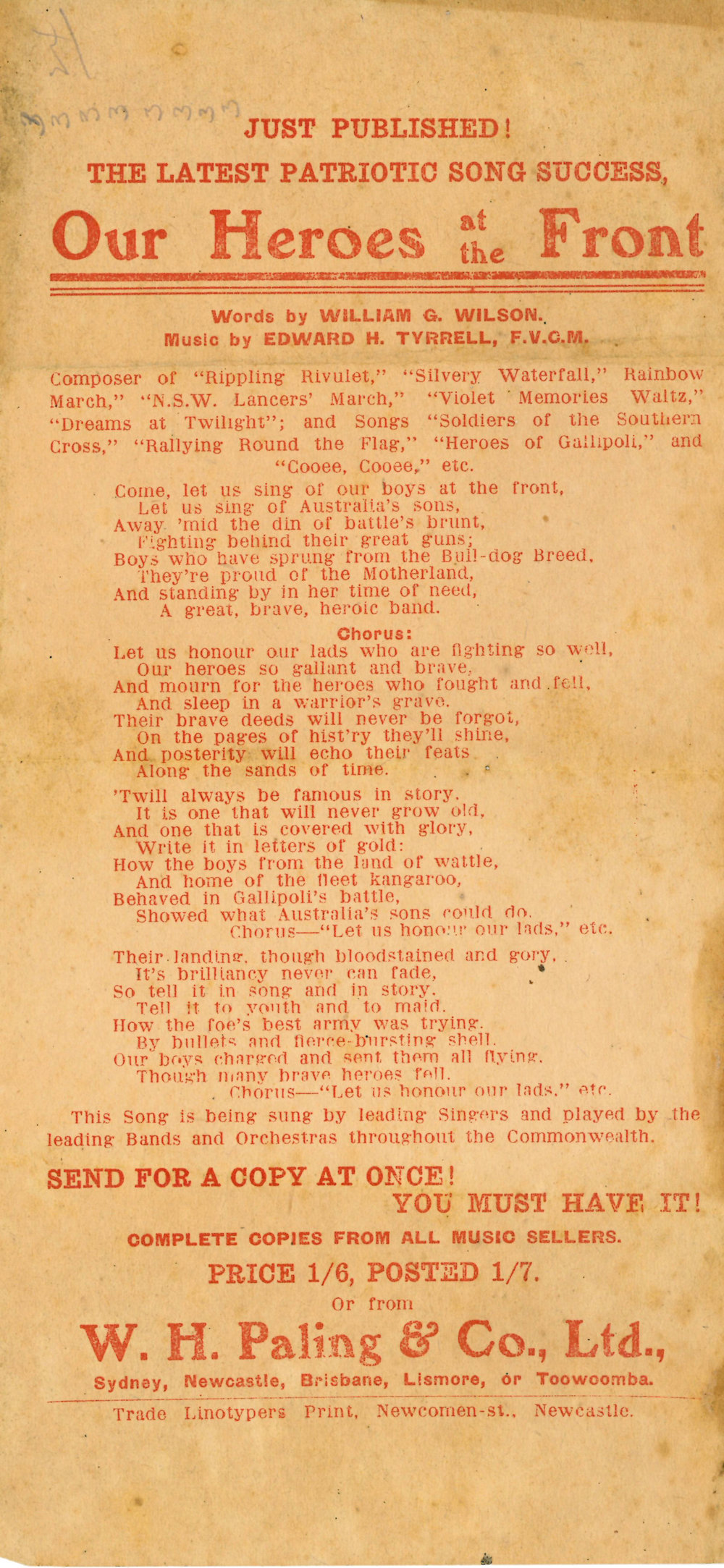 Patriotic Song - "Our Heroes at the Front" Lyrics, [C2018(ii)_052]. Living Histories, accessed 08/02/2026, https://livinghistories.newcastle.edu.au/nodes/view/68927