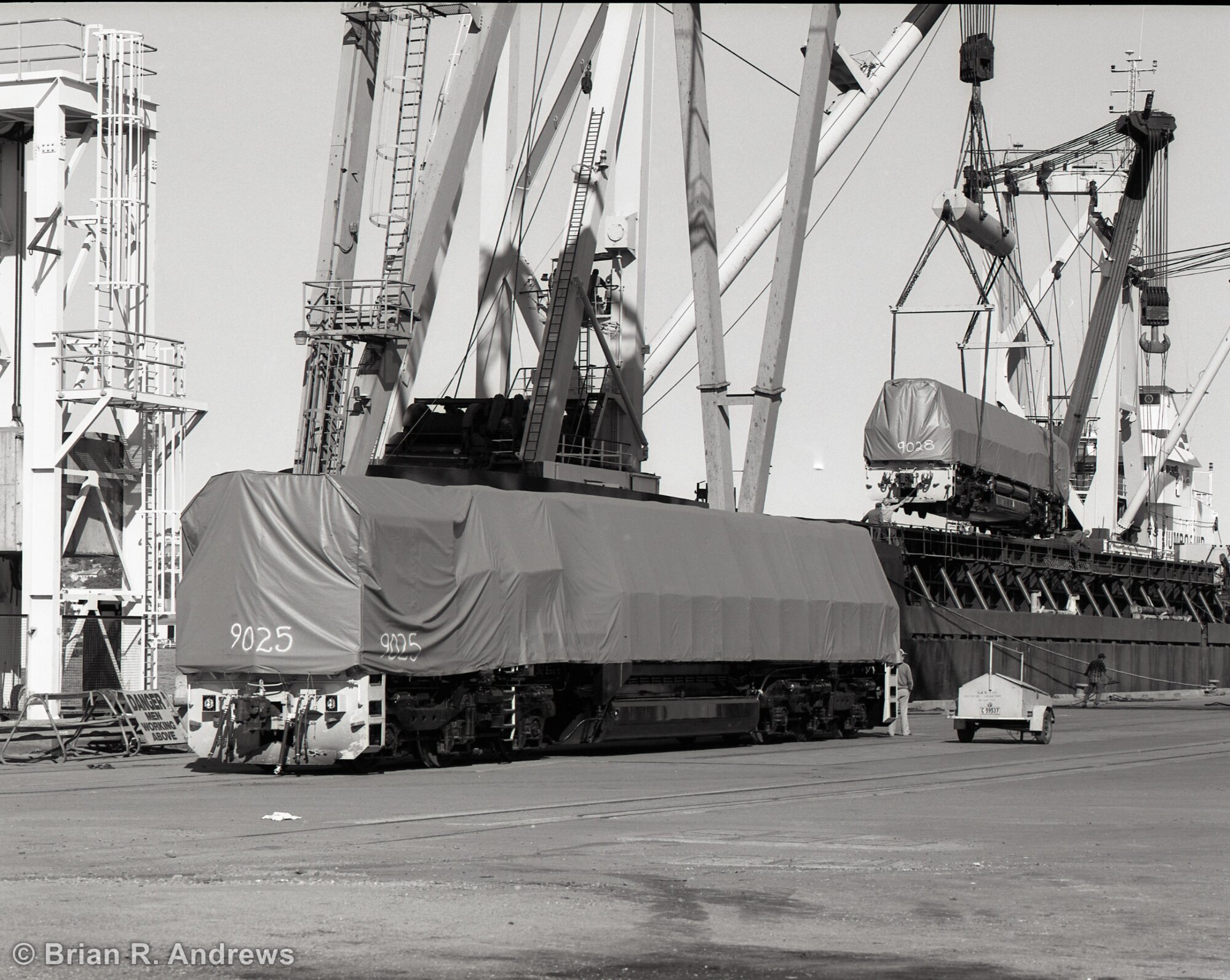 Andrews, Brian R., Unloading from M.V. Mirabella, 28 July 1994, 9025 on wharf, 9028 in air behind, 90 class locomotives. (1994-07-28), [BRAN696_006]. Living Histories, accessed 18/01/2026, https://livinghistories.newcastle.edu.au/nodes/view/69174