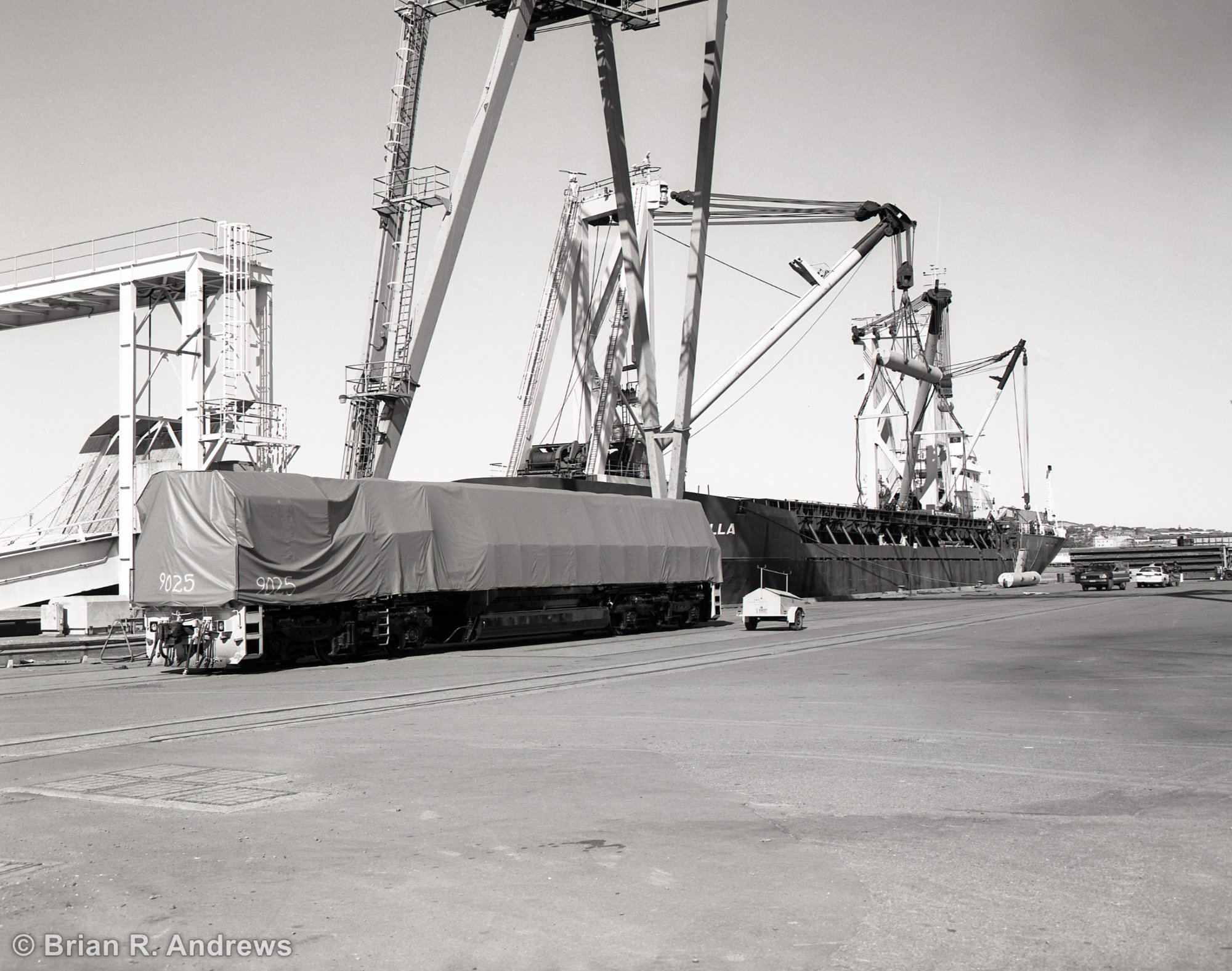 Andrews, Brian R., Unloading from M.V. Mirabella, 9025 on wharf, 28 July 1994, 90 class locomotives. (1994-07-28), [BRAN696_001]. Living Histories, accessed 16/02/2026, https://livinghistories.newcastle.edu.au/nodes/view/69179