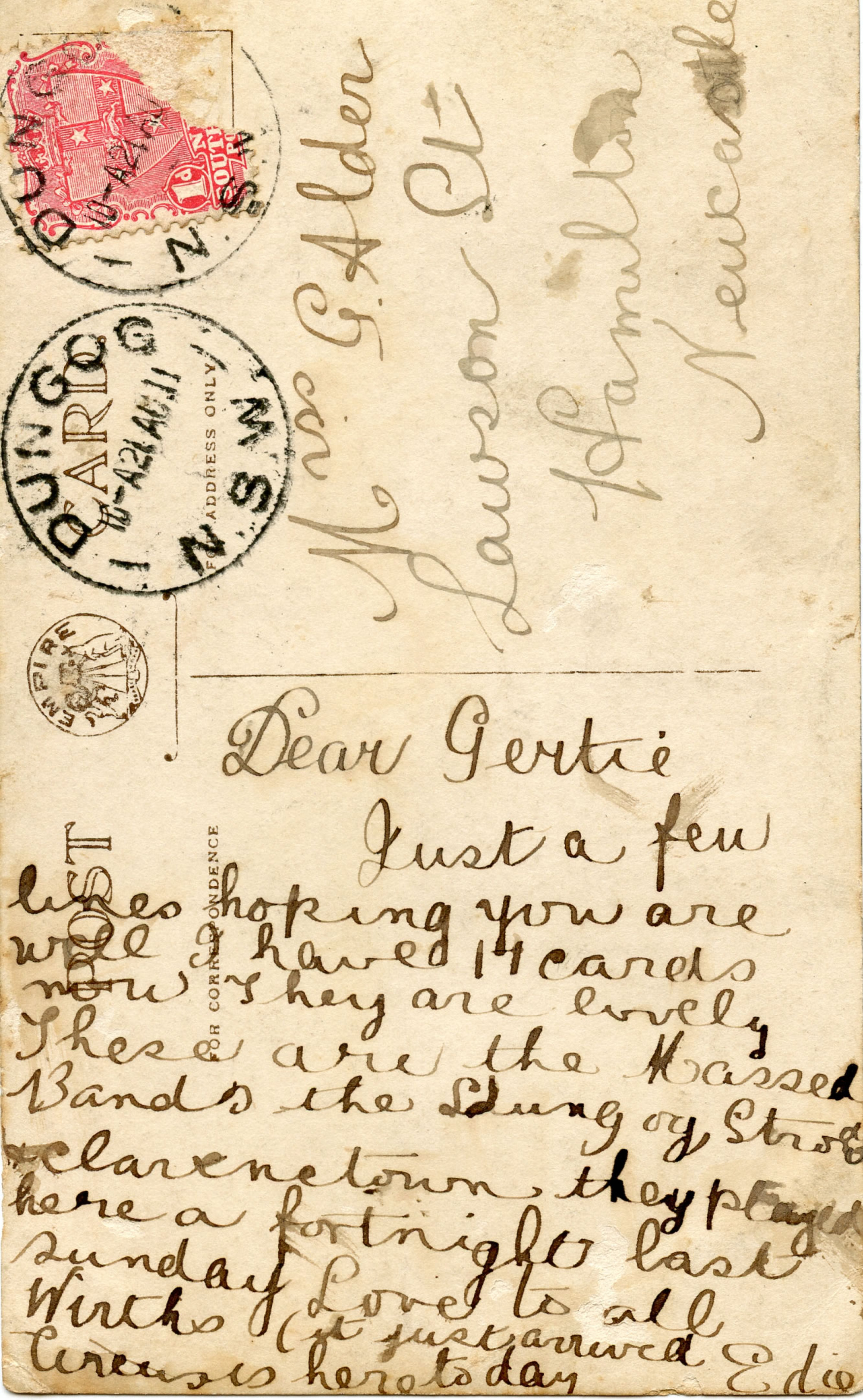 Kelly, George, Postcard from Edie Kelly to Miss Gertie Alder, 21st August 1911 (1911), [A9020 (xiii)-004-Dungog-verso]. Living Histories, accessed 16/04/2026, https://livinghistories.newcastle.edu.au/nodes/view/6978