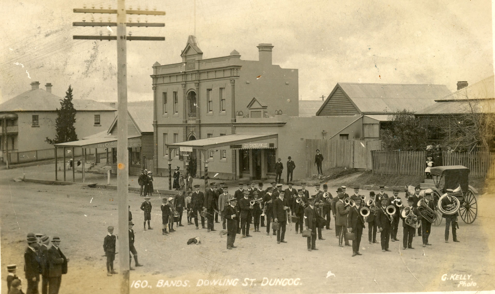 Kelly, George, 160. BANDS, DOWLING ST. DUNGOG. G. KELLY. Photo [1911] ([1911]), [A9020 (xiii)-019-Dungog-recto]. Living Histories, accessed 15/04/2026, https://livinghistories.newcastle.edu.au/nodes/view/6979