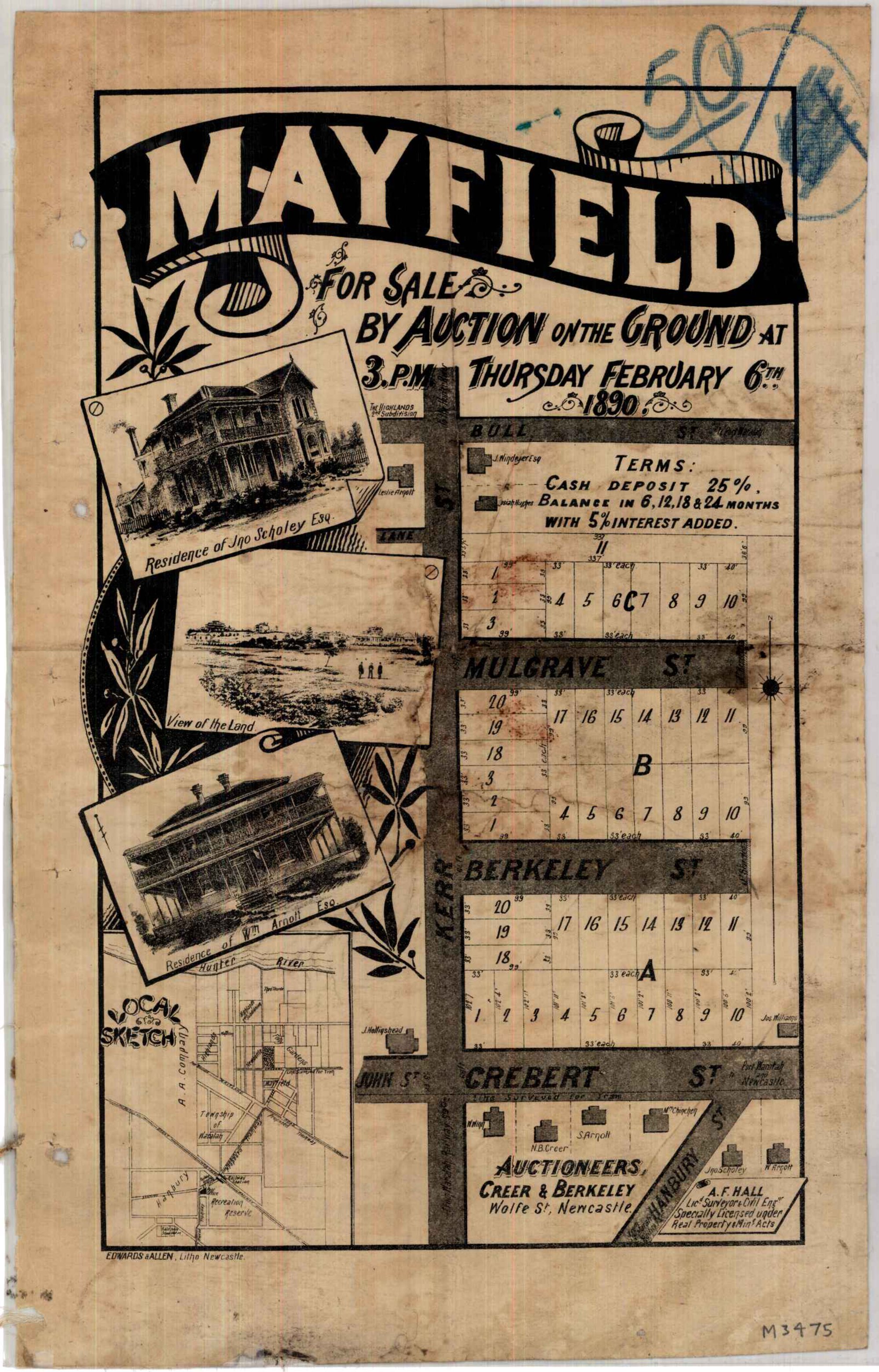 A. F. Hall, Mayfield Subdivision, Thursday, 6 February 1890. (6th February 1890), [M3475]. Living Histories, accessed 18/03/2026, https://livinghistories.newcastle.edu.au/nodes/view/69803
