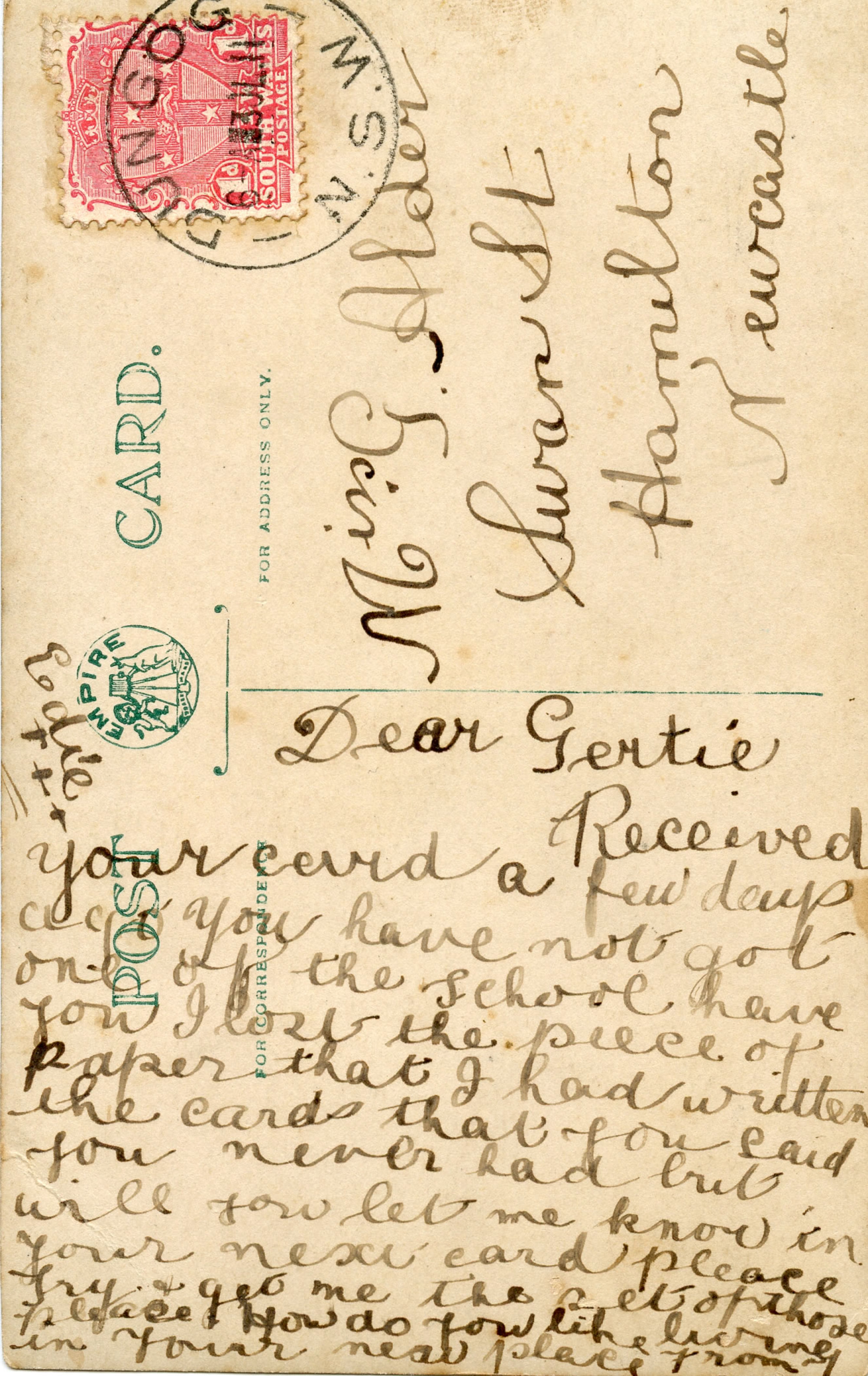 Kelly, George, Postcard from Edie Kelly to Miss Gertie Alder, 3rd July 1911 (1911), [A9020 (xiii)-017-Dungog-verso]. Living Histories, accessed 19/03/2026, https://livinghistories.newcastle.edu.au/nodes/view/6982
