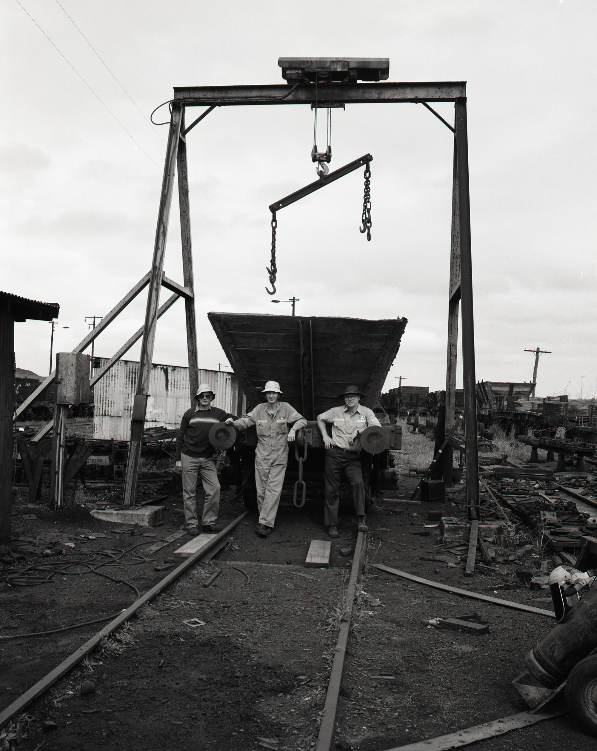 Andrews, Brian Robert, Waggon builders with last waggon under hoist, 21 September 1987, on the last Monday Richmond Vale Railway worked, Hexham sidings (21st September 1987), [BRAN462_006]. Living Histories, accessed 22/01/2026, https://livinghistories.newcastle.edu.au/nodes/view/69901