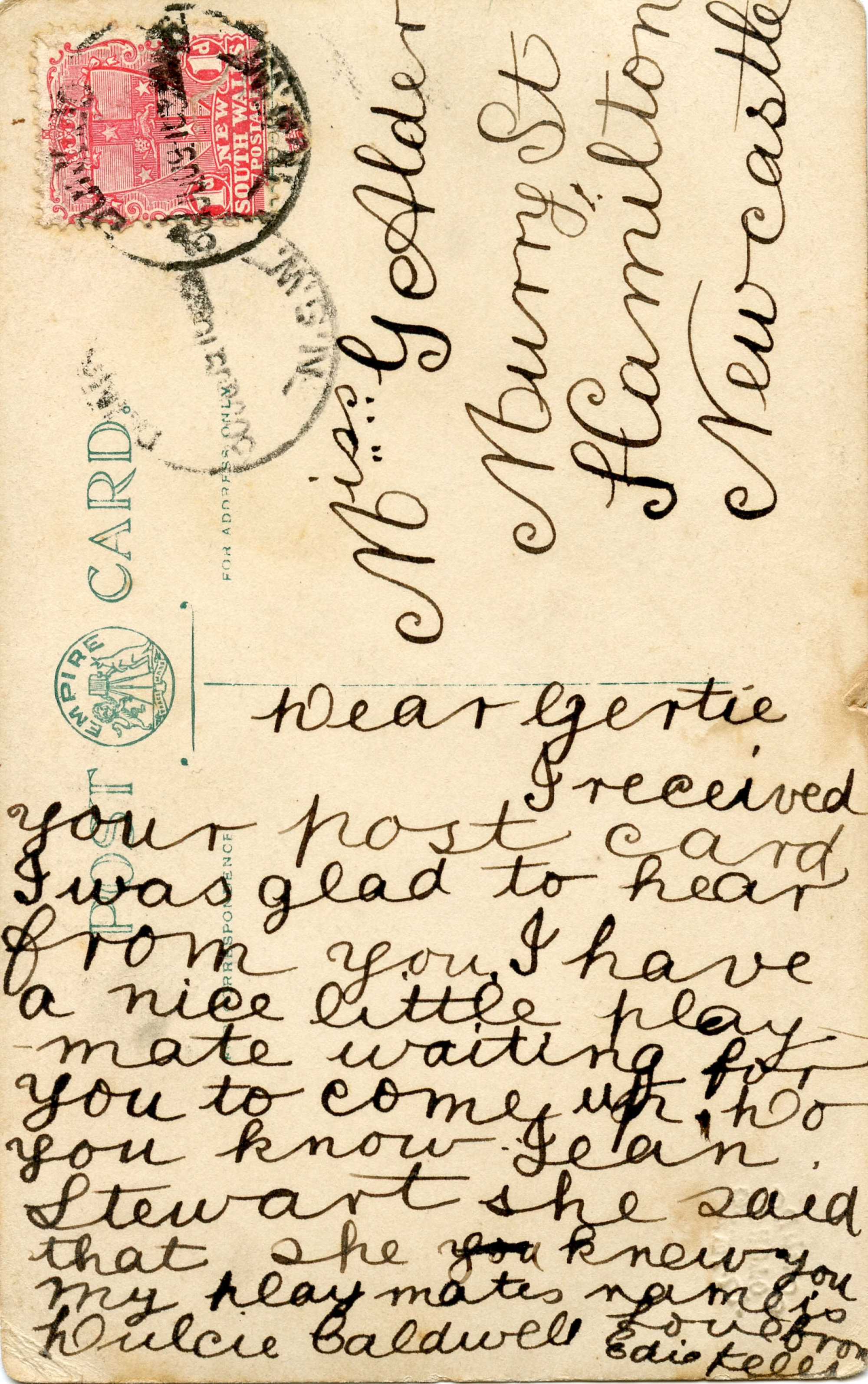 Kelly, George, Postcard from Edie Kelly to Miss Gertie Alder, 30th July 1909 (1909), [A9020 (xiii)-003-Dungog-verso]. Living Histories, accessed 21/01/2026, https://livinghistories.newcastle.edu.au/nodes/view/7011