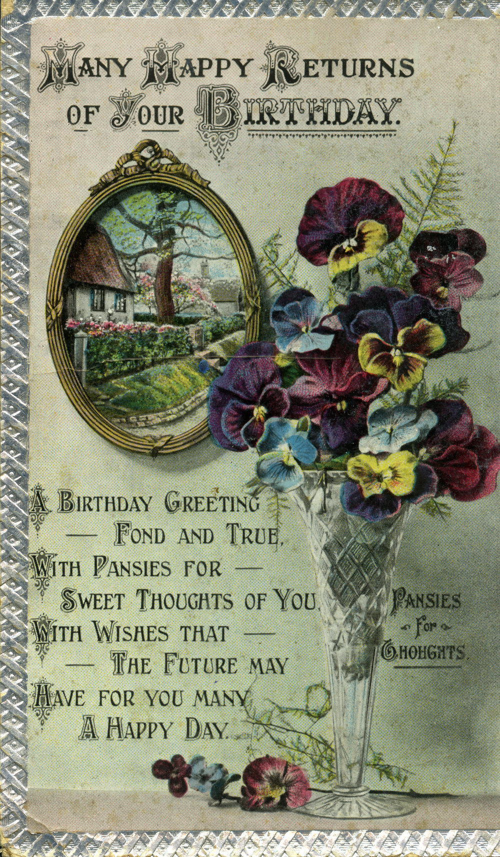 Birthday card - pansies and cottage scene (1919-1926), [C2019(ii)_027]. Living Histories, accessed 15/02/2026, https://livinghistories.newcastle.edu.au/nodes/view/70153