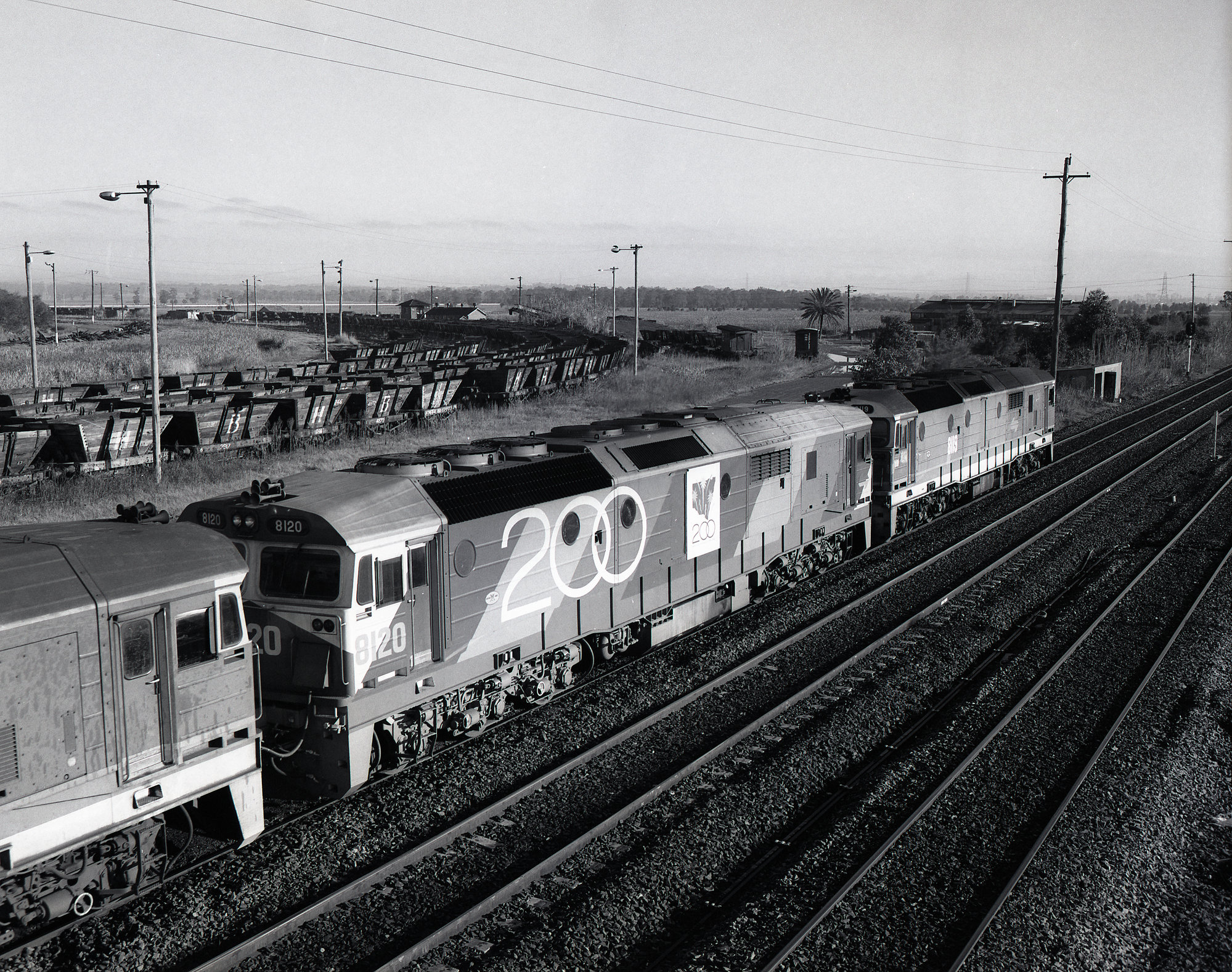 Andrews, Brian Robert, 3 x 81 class, down coal train, June 1988, Hexham sidings (June 1988), [BRAN500_010]. Living Histories, accessed 15/04/2026, https://livinghistories.newcastle.edu.au/nodes/view/70178