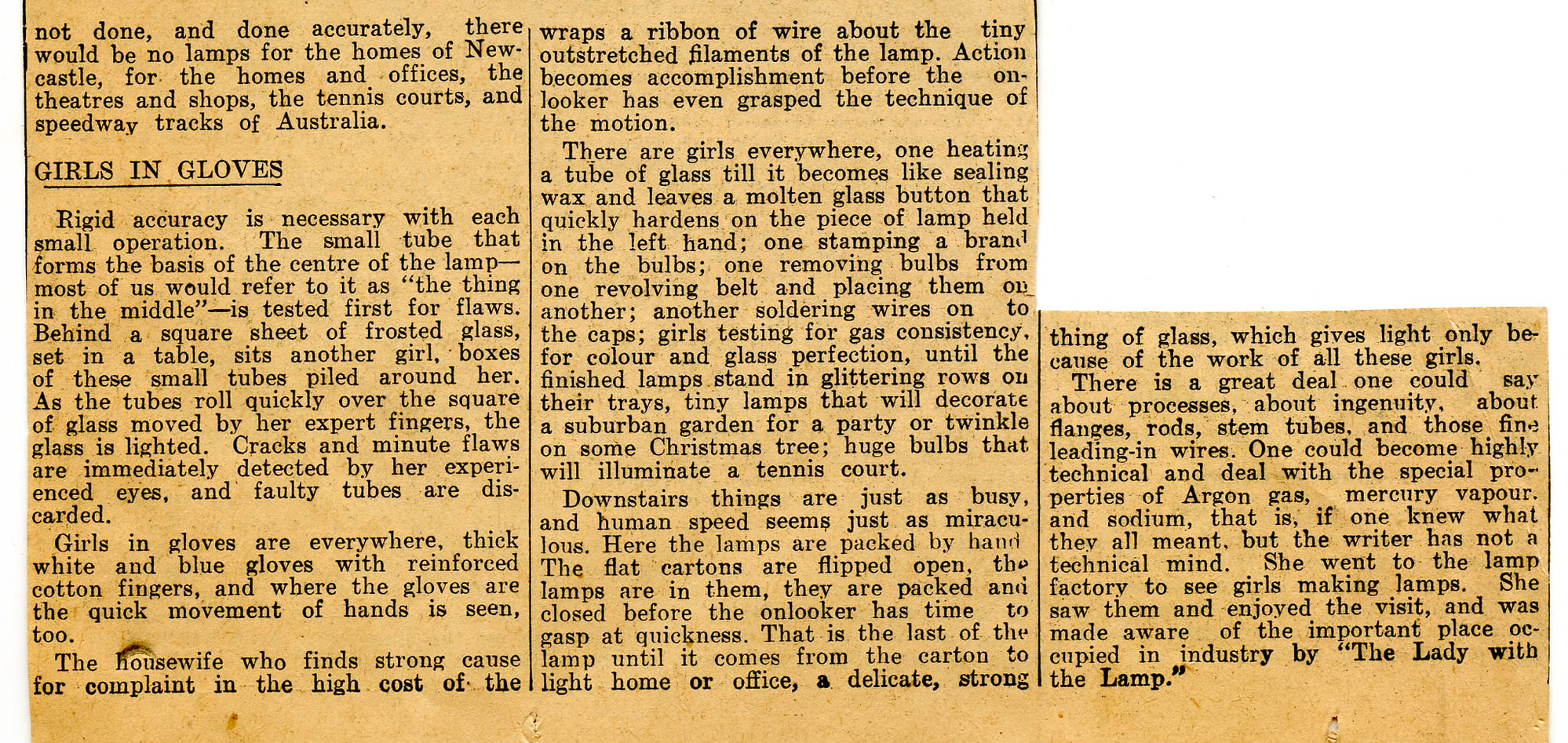 Newcastle Morning Herald and Miners' Advocate, ELMA Women in industry - Girls in gloves (28th May 1938), [A8521-xxiii-003]. Living Histories, accessed 18/03/2026, https://livinghistories.newcastle.edu.au/nodes/view/7026