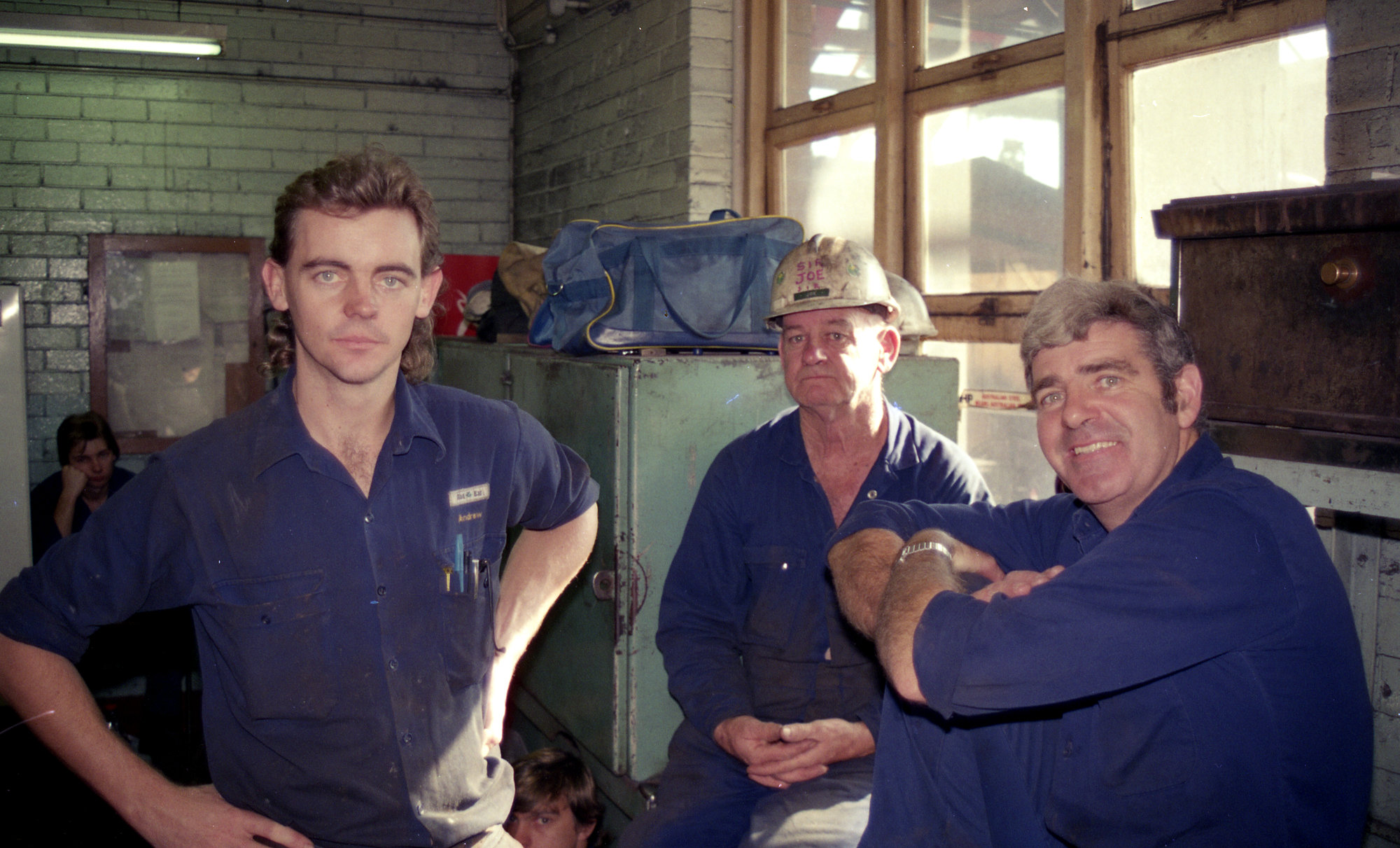 BHP Newcastle - Gavin Bowden (left background) Andy Burns, Hilary Joseph Fay (Joe), and Peter Archer, Blast Furnace Mechanics Workshop, April 1989