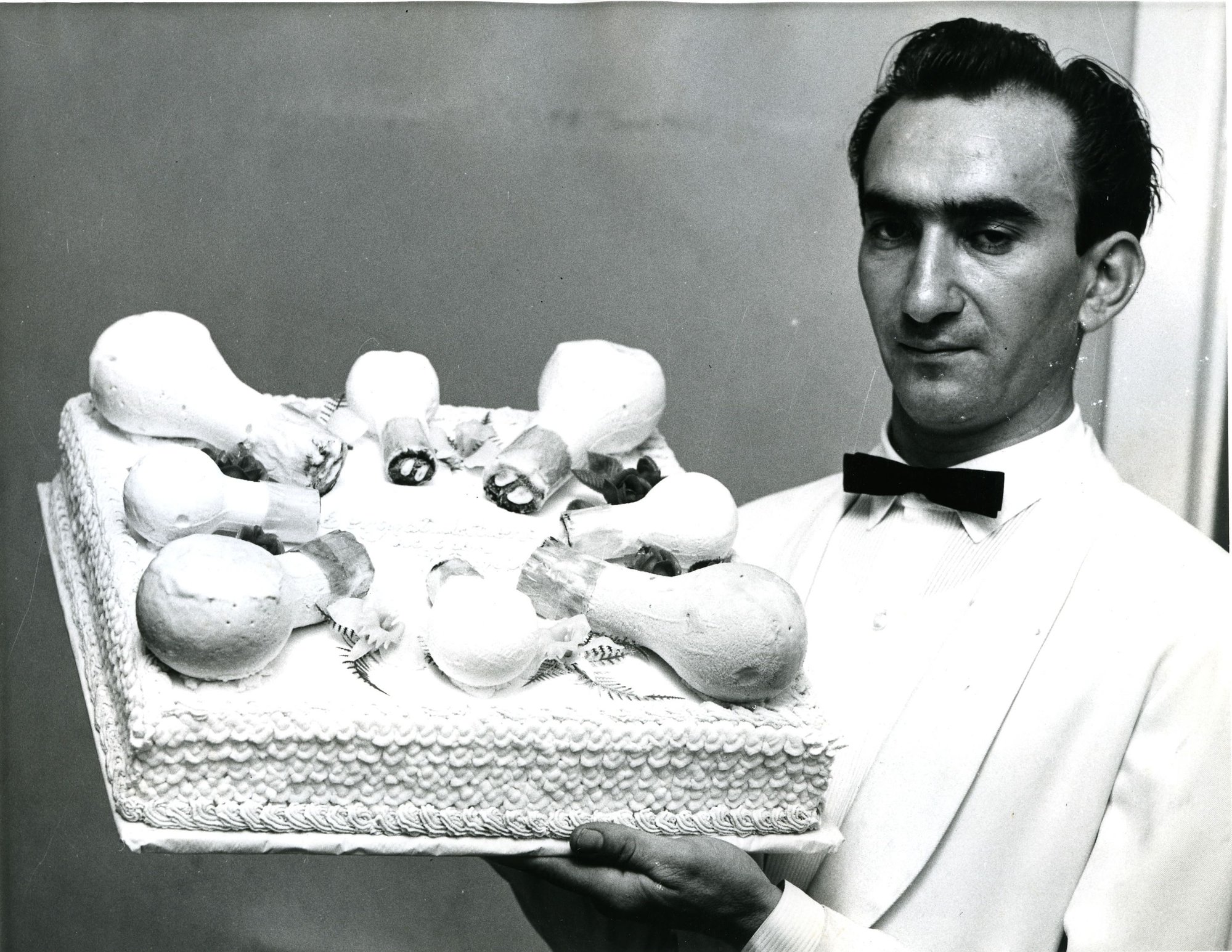 Elma - themed retirement cake. Photograph of Company Farewells to Bob Vandenburg [c.1960s] and F.N. Leddy, 24th May 1962. (1962), [A8521-xxi-019]. Living Histories, accessed 17/01/2026, https://livinghistories.newcastle.edu.au/nodes/view/7063