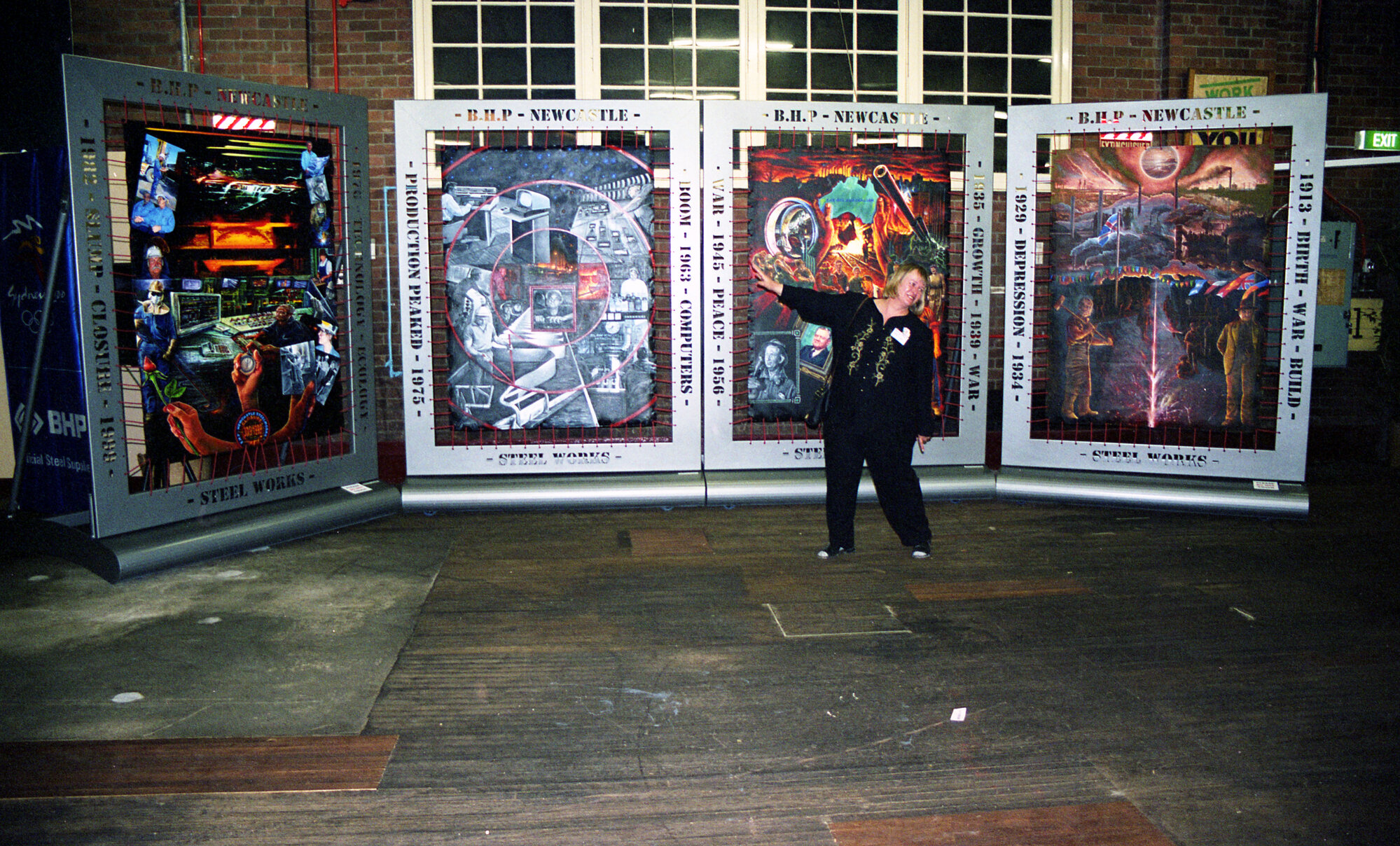 Ruddick, William, Birgitte Hansen, Muralist, with her work commissioned for 'Ribbons of Steel', closure ceremony, Tool Room, 26th August 1999 (1999-08), [Ruddick_BHP_7_009]. Living Histories, accessed 07/03/2026, https://livinghistories.newcastle.edu.au/nodes/view/70797