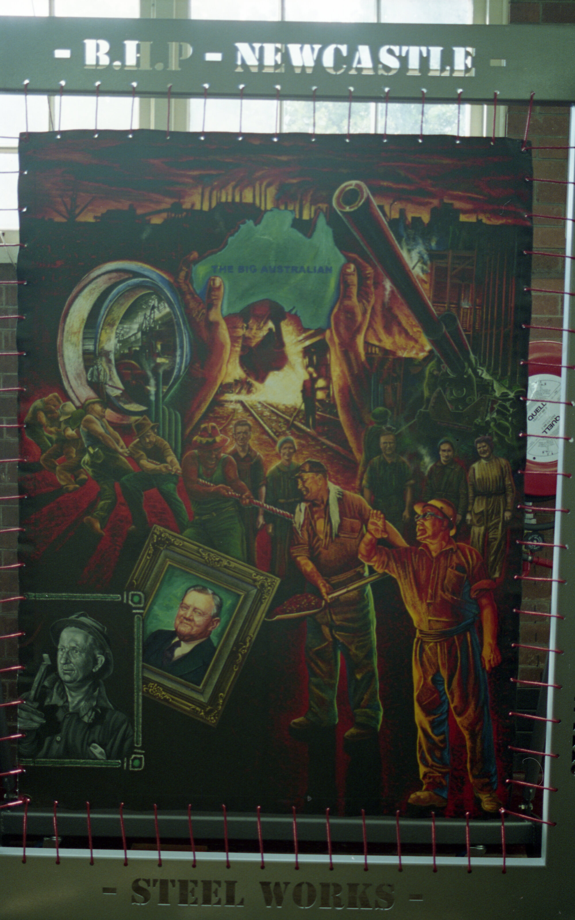 Ruddick, William, Birgitte Hansen mural commissioned for "Ribbons Of Steel" closure ceremony, Tool Room, September 1999 (1999-09), [Ruddick_BHP_8_021]. Living Histories, accessed 18/03/2026, https://livinghistories.newcastle.edu.au/nodes/view/70844
