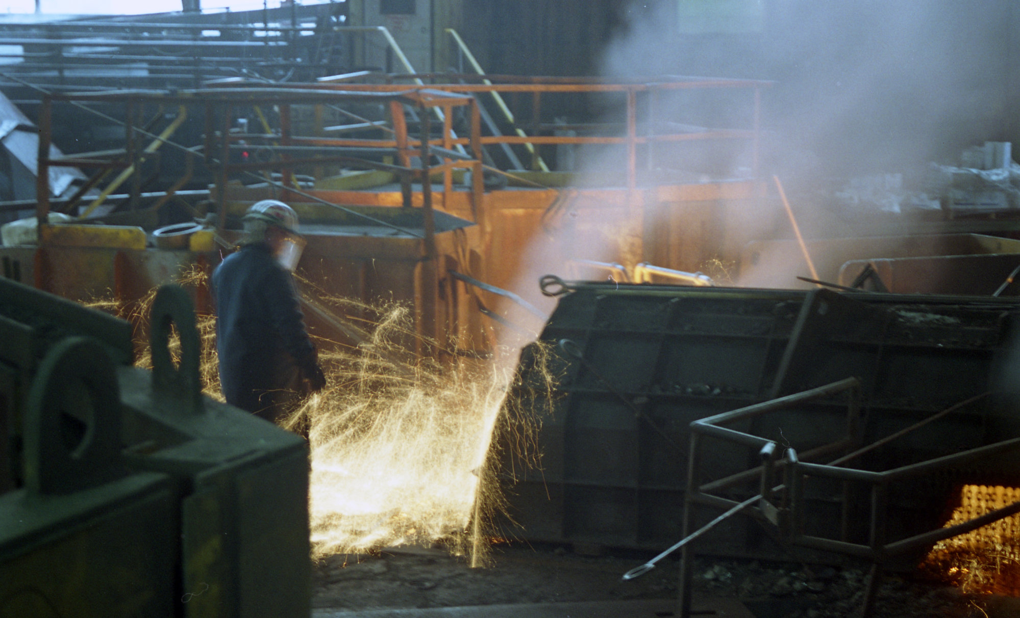 Ruddick, William, No. 3 Blast Furnace, No. 2 Casthouse Floor, operator is using wooden ploe to break up "skulls" forming on the hot metal runner, BHP Newcastle, September 1999 (1999-09), [Ruddick_BHP_10_009]. Living Histories, accessed 17/04/2026, https://livinghistories.newcastle.edu.au/nodes/view/70896