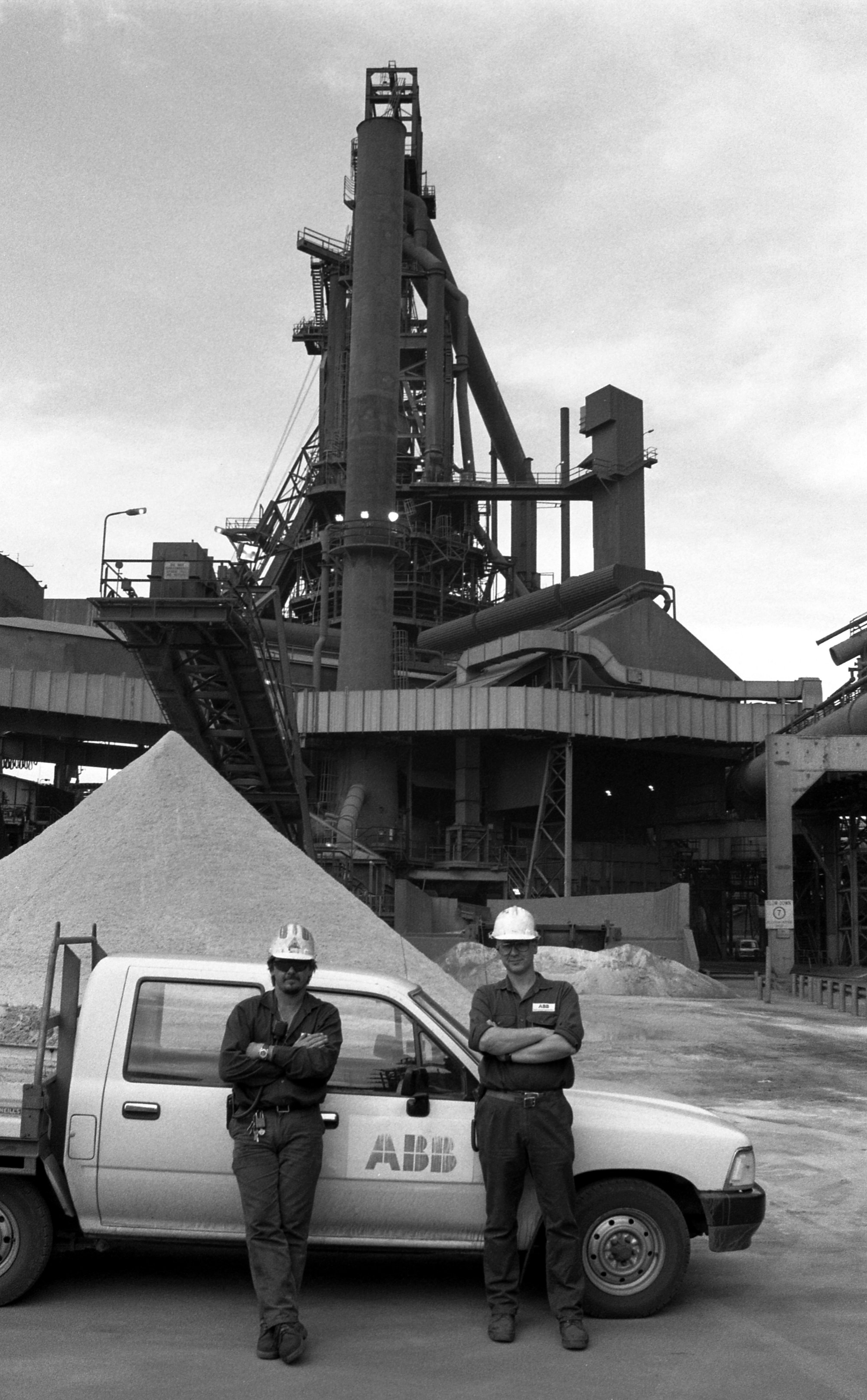 Gavin Bowden & Karl Bamber, ABB Alliance Supervisors, ex BHP Newcastle Blast Furnace Tradesmen, No. 3 Blast Furnace Granulated Slag stockpile behind, April 1999