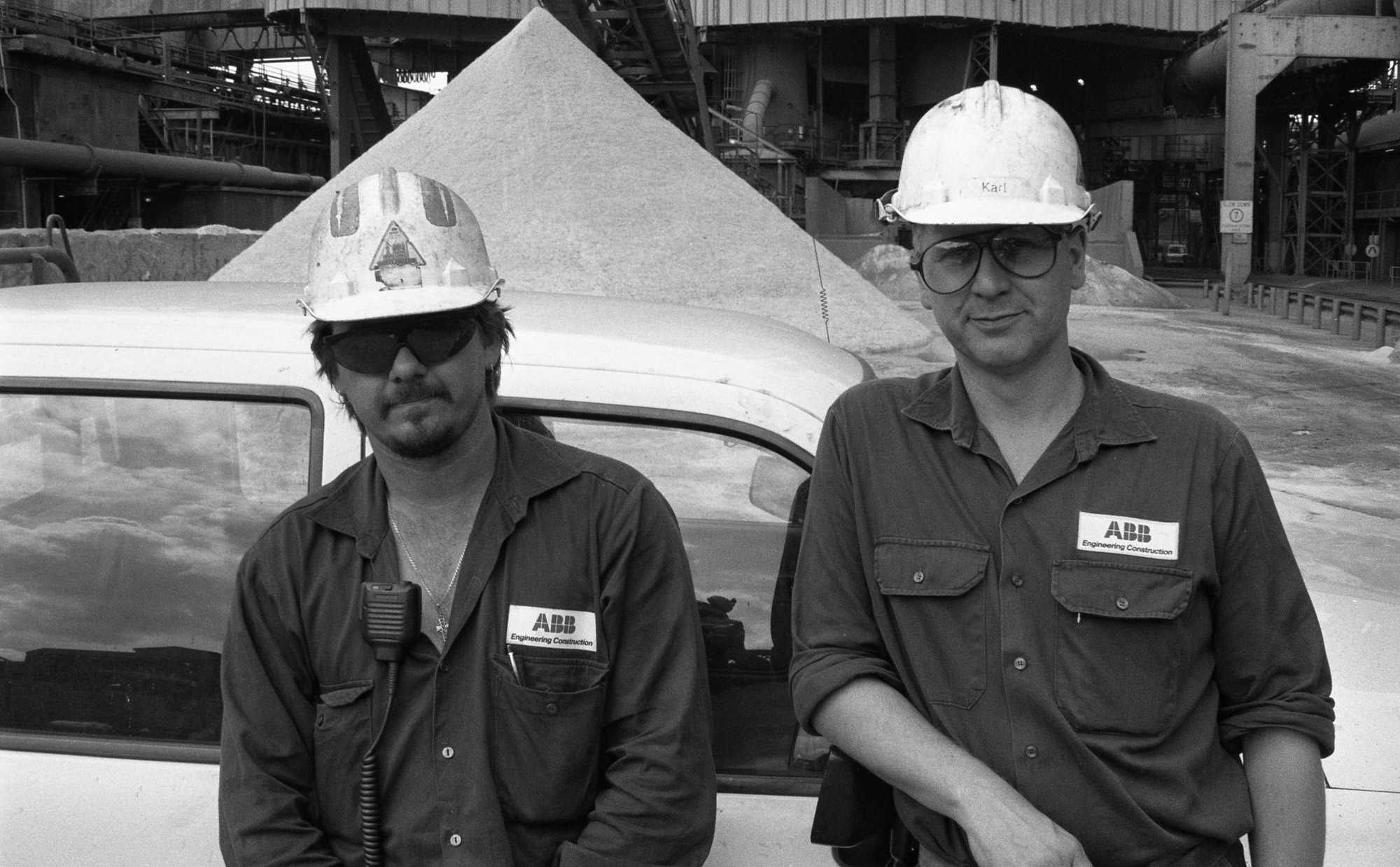 Gavin Bowden & Karl Bamber, ABB Alliance Supervisors, ex BHP Newcastle Blast Furnace Tradesmen, No. 3 Blast Furnace Granulated Slag stockpile behind, April 1999