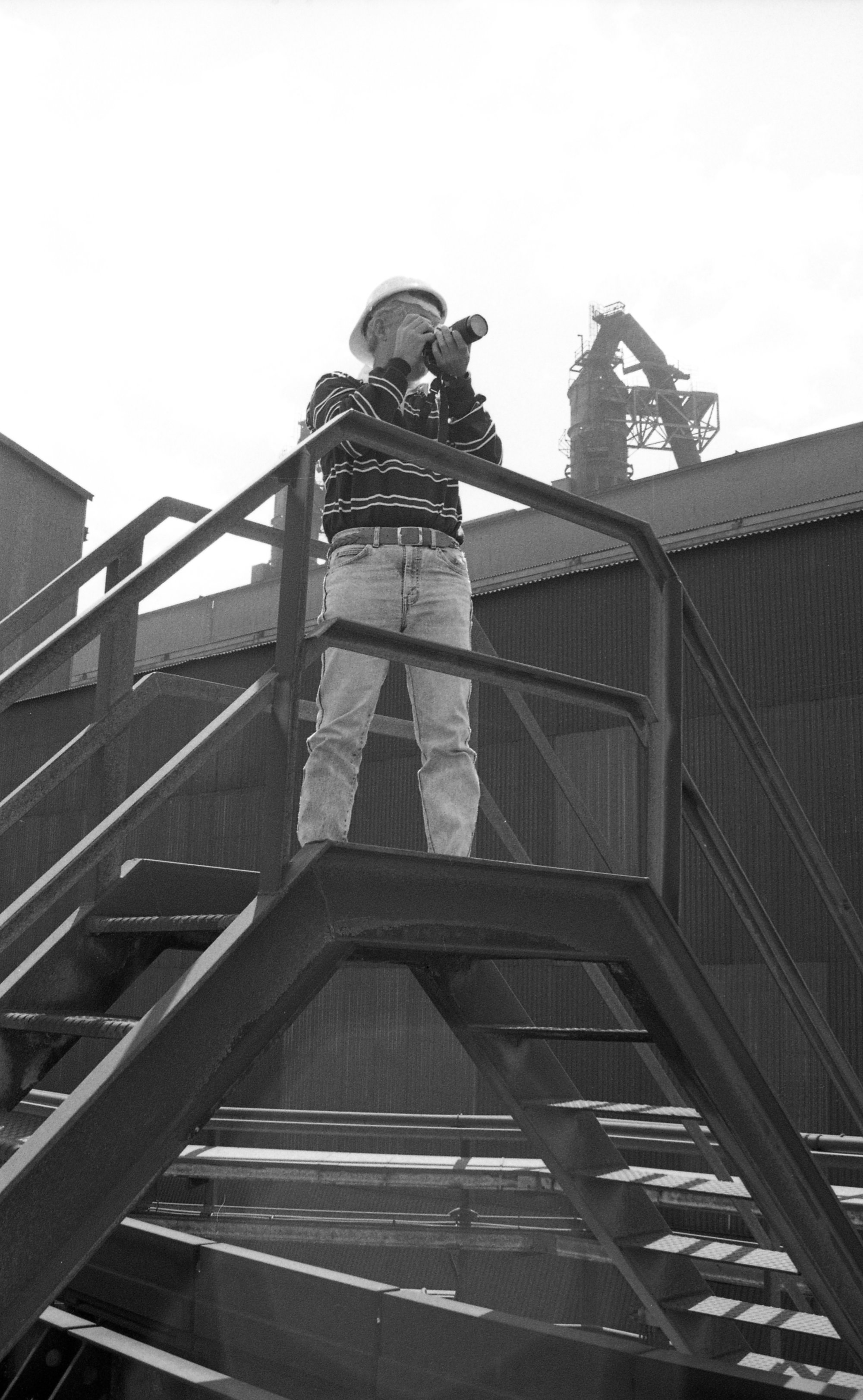 Ruddick, William, Steve Ford on Bloom Caster overhead Roller Table bridge, BHP Newcastle, c. 1997 (1997), [Ruddick_Roll_25_005]. Living Histories, accessed 12/03/2026, https://livinghistories.newcastle.edu.au/nodes/view/71333