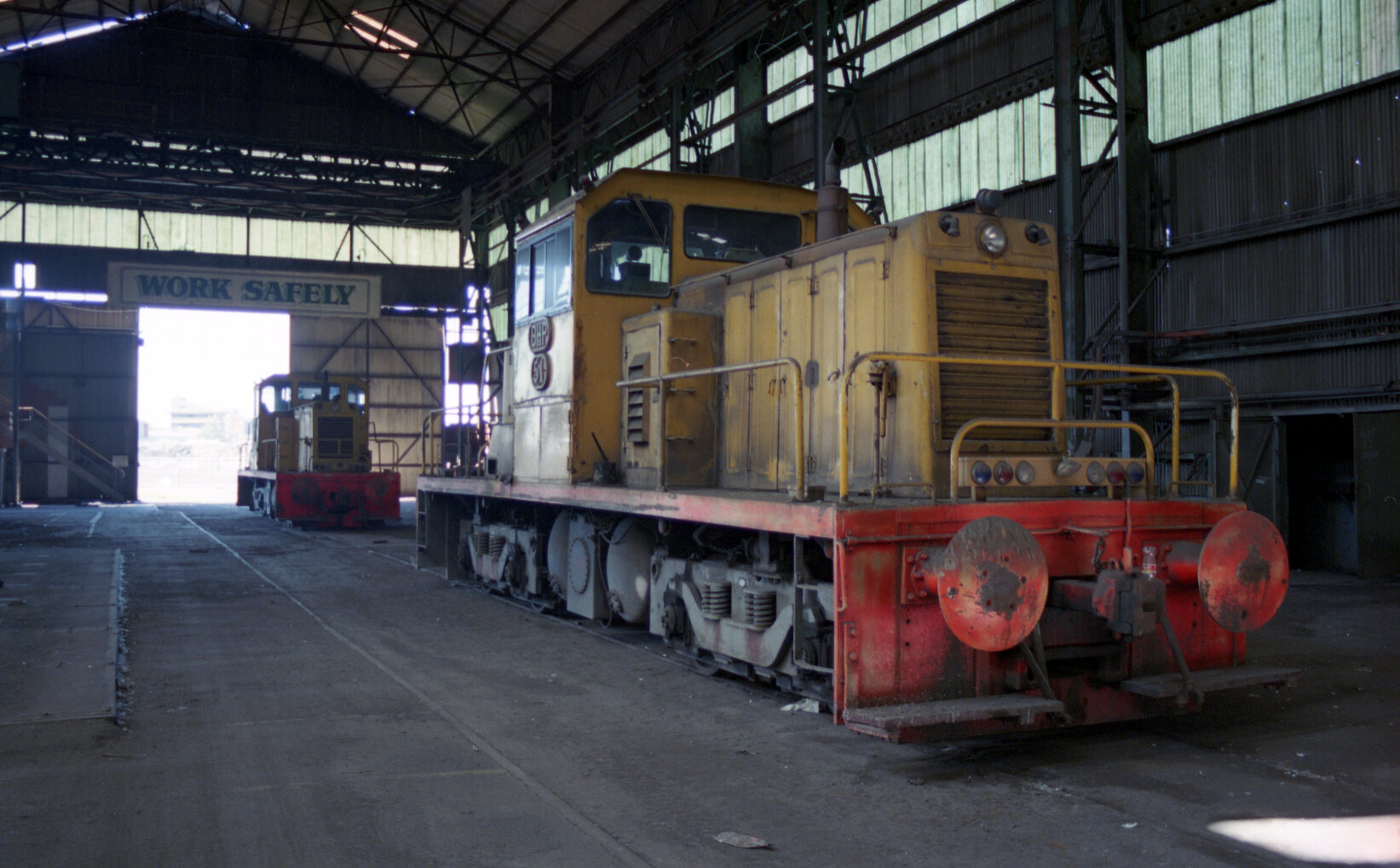 Ruddick, William, Diesel Locos in Fabrication Shop, No. 51 closest to camera, NIHA tour, BHP Newcastle, 27th February 2002 (2002-02-27), [Ruddick_BHP_24_033]. Living Histories, accessed 13/02/2026, https://livinghistories.newcastle.edu.au/nodes/view/71767
