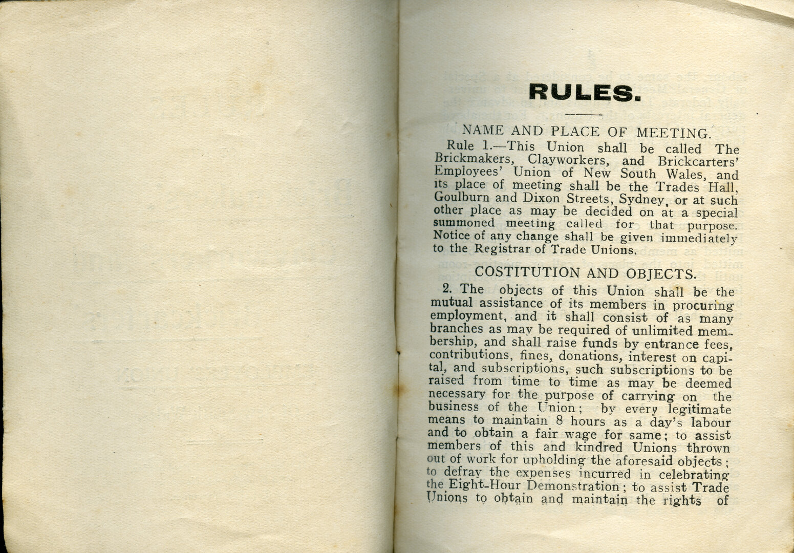 Page3 of the Booklet titled Rules of the Brickmakers Clayworkers and Brickcarters Employees Union, [C2019(xii)_003]. Living Histories, accessed 14/04/2026, https://livinghistories.newcastle.edu.au/nodes/view/72608