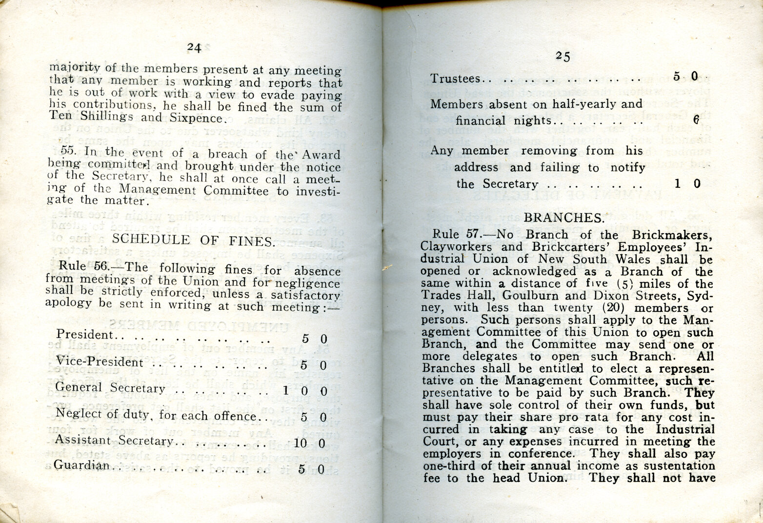 Pages 24 and 25 of the Booklet titled Rules of the Brickmakers Clayworkers and Brickcarters Employees Union, [C2019(xii)_014]. Living Histories, accessed 17/04/2026, https://livinghistories.newcastle.edu.au/nodes/view/72619