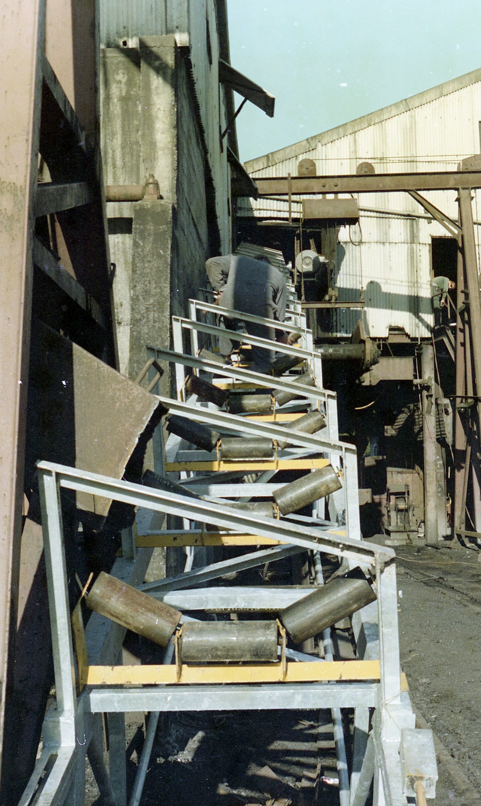 Cobbles Return Conveyor under construction, Stockrington No. 2 Colliery screens, NSW, May 1976