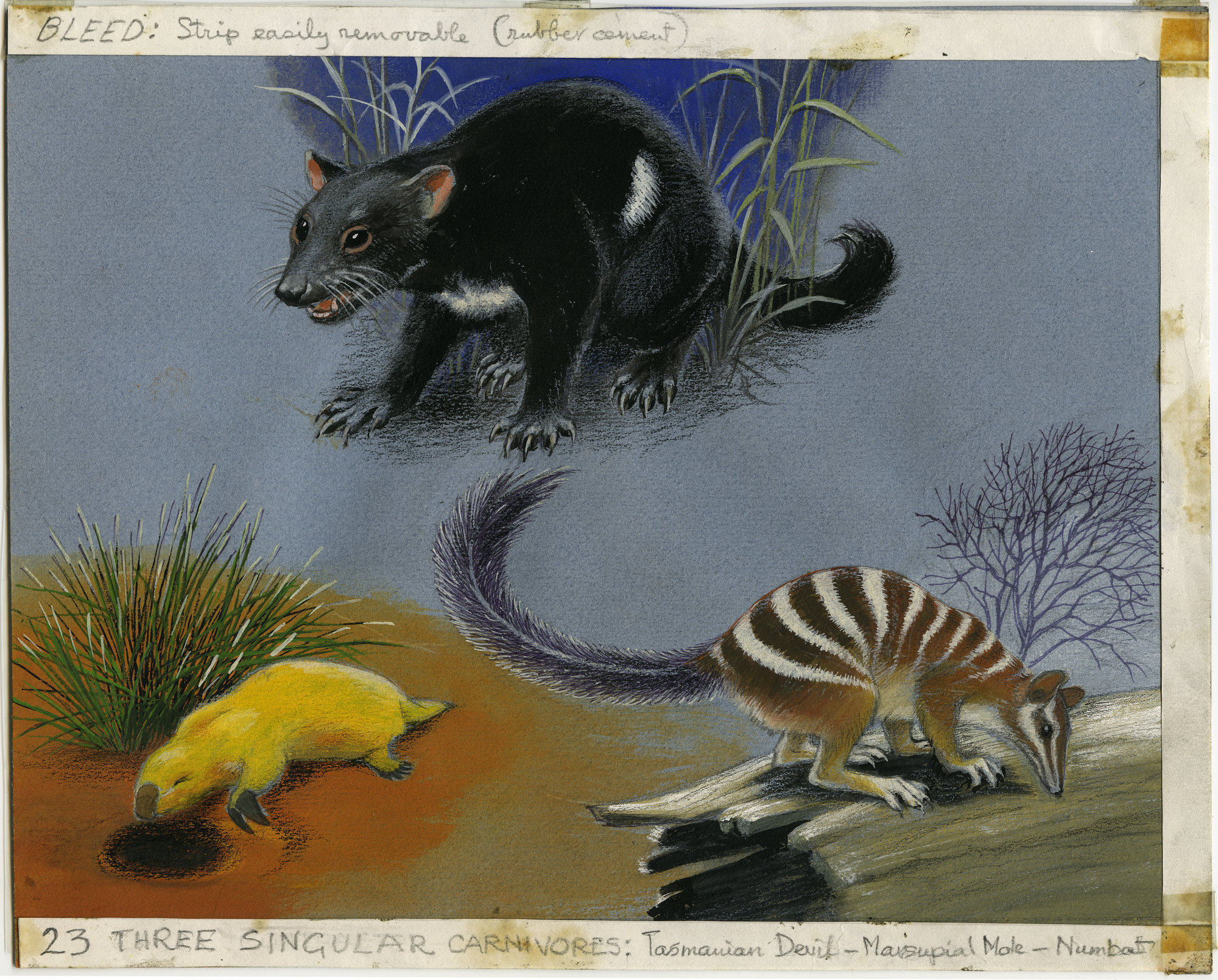 Senior, Margaret, 1917-1995, Australia's Animals 23 Three Singular carnivores: Tasmanian devil - Marsupial Mole - Numbat (page 51) (1987), [MS1286]. Living Histories, accessed 17/01/2026, https://livinghistories.newcastle.edu.au/nodes/view/72985