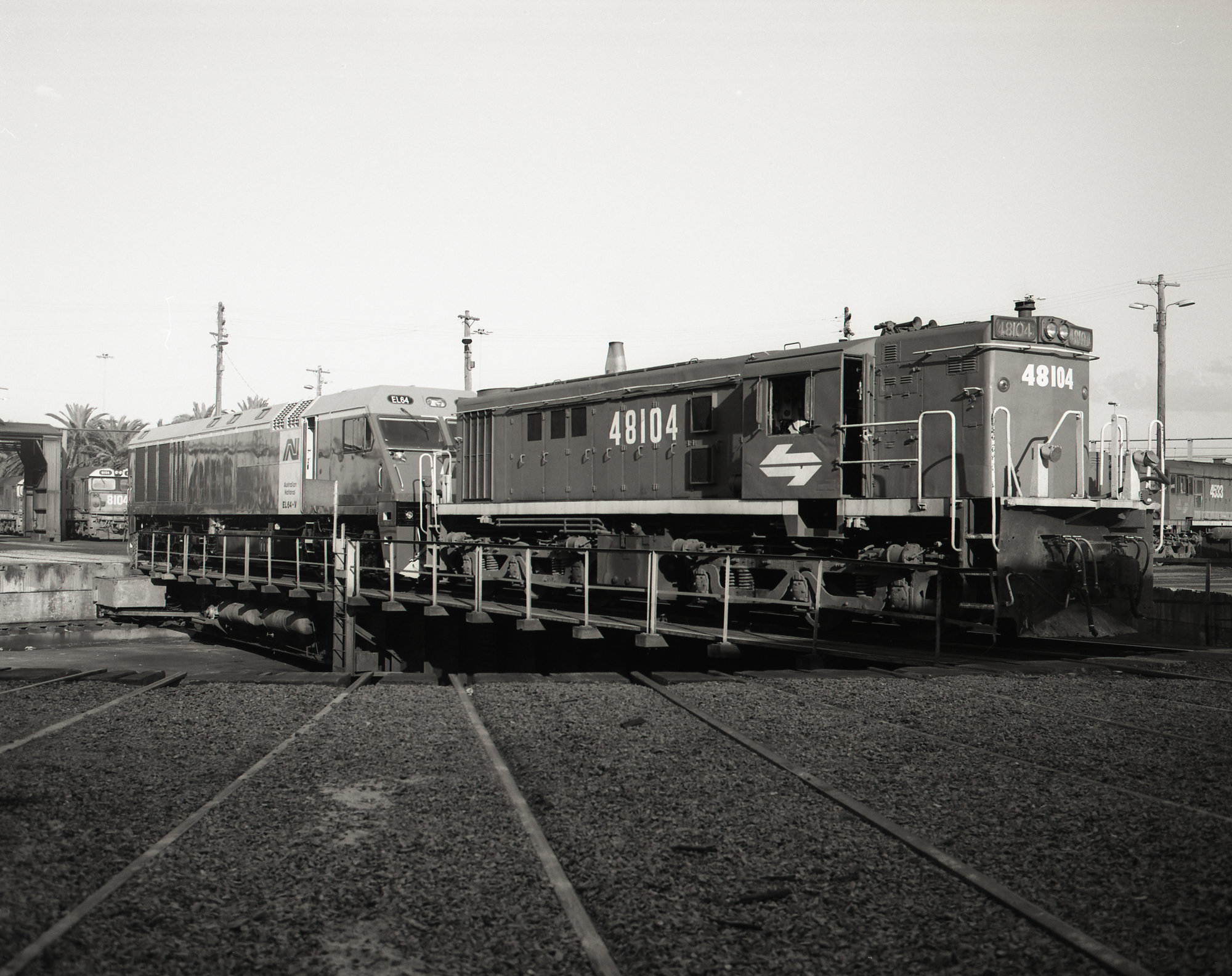 Australian National EL 64 and 48104 on turntable at Loco Broadmeadow, near chargeman's office, 7 October 1991
