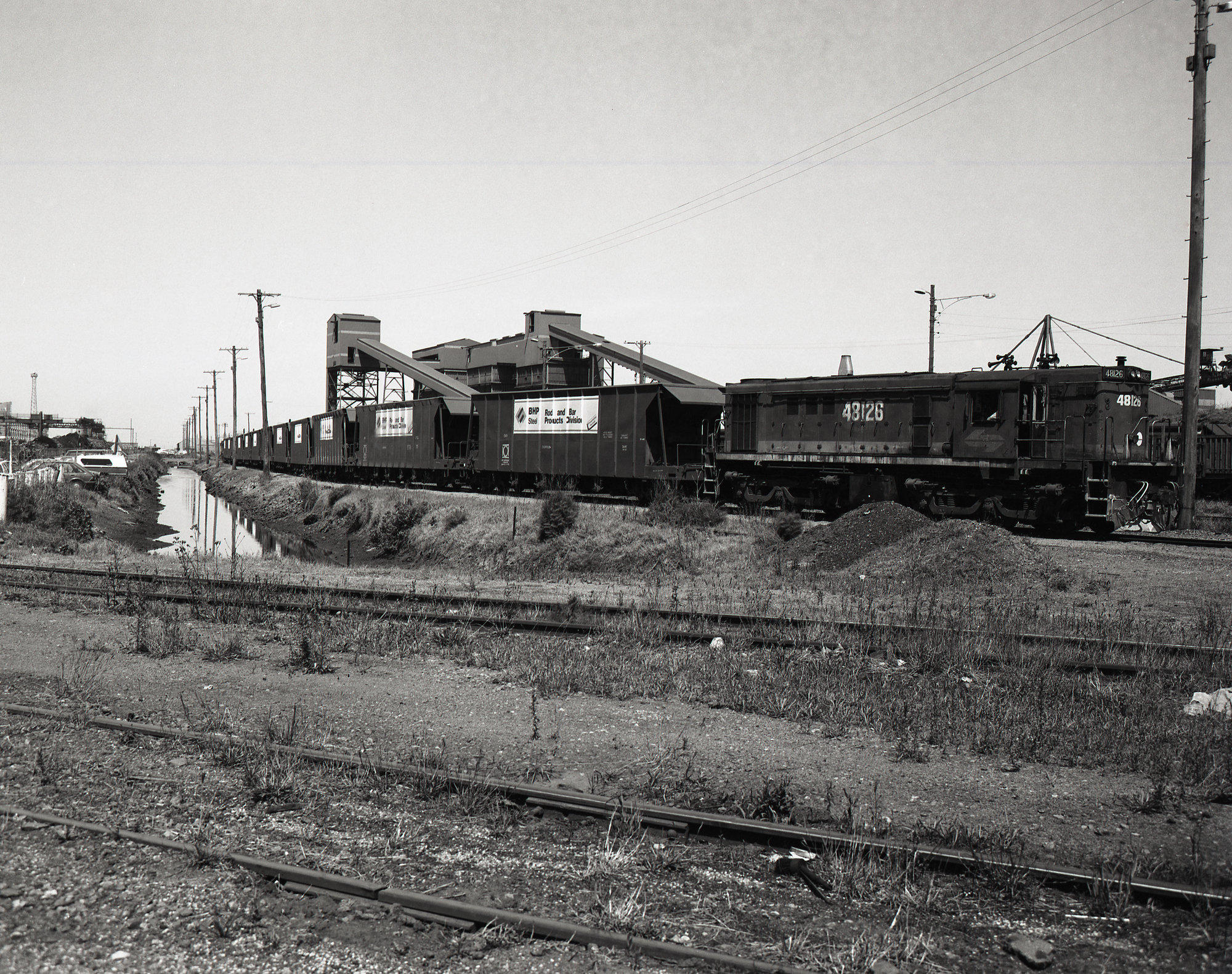 Andrews, Brian Robert, 48126 leaving Morandoo with train of BHP waggons, 19 November 1991 (19th November 1991), [BRAN640_008]. Living Histories, accessed 16/02/2026, https://livinghistories.newcastle.edu.au/nodes/view/73946