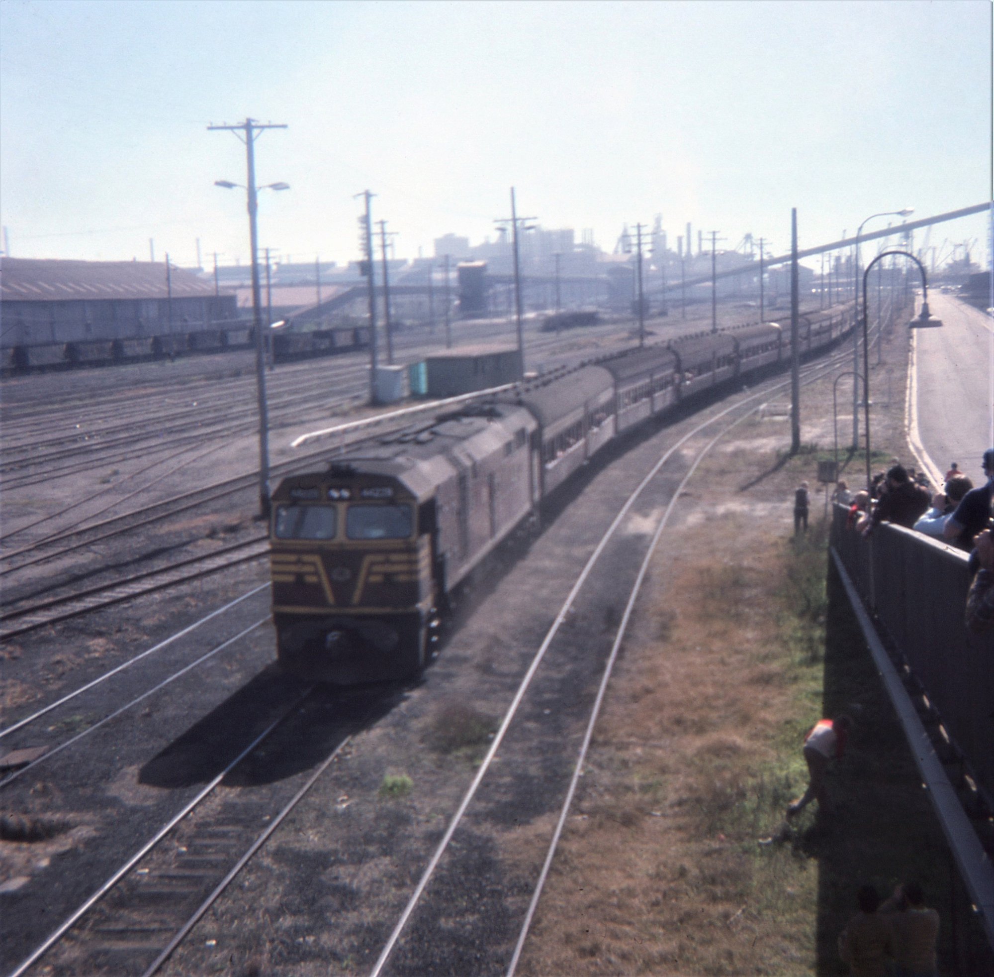A442 class pauses at Bullock Island for a photo stop during the Mount Thorley tour, August 1978.