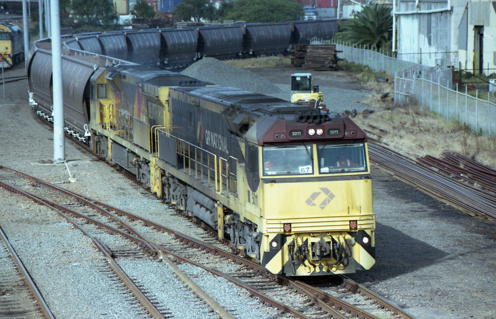 Sansom, Peter, QR National 5011 at the head of a coal train at Bullock Island, July 2015. (2015-07), [Sansom_PW_1972-2017_543]. Living Histories, accessed 15/04/2026, https://livinghistories.newcastle.edu.au/nodes/view/74194