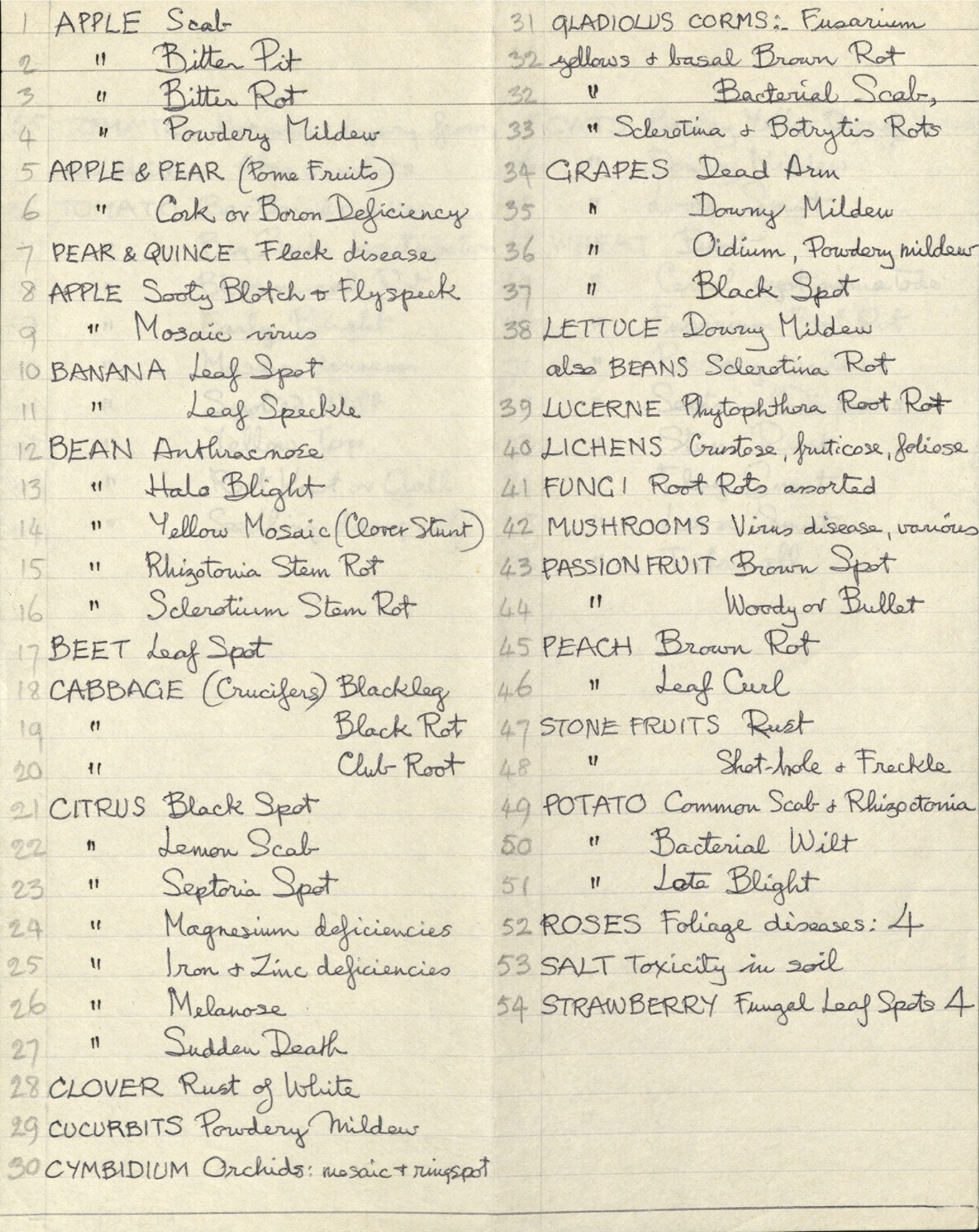 Senior, Margaret, 1917-1995, Untitled (hand written list of plants and diseases), [MS1884]. Living Histories, accessed 15/02/2026, https://livinghistories.newcastle.edu.au/nodes/view/74376